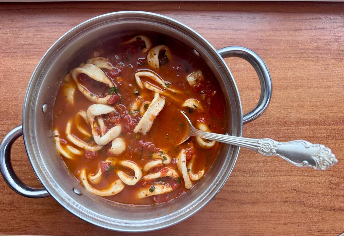 Ингредиенты: 1️⃣ Кальмары - 1 кг 2️⃣ Резаные томаты - 400 гр (удобно использовать консервированные в собственном соку) 3️⃣ Лук репчатый (лучше шалот) - 100 гр 4️⃣ Сухие итальянские травы - 1 ч.л 5️⃣ Зелёный базилик - 1 веточка 6️⃣ Рюмка коньяка 7️⃣ Чеснок - 1 маленький зубчик 8️⃣ Чёрный перец - 1/2 ч.л 9️⃣ Цедра 1/2 лимона 🔟 Вода - 150 мл Приготовление: 1. Кальмаров мягко разморозить (на нижней полке холодильника). Очистить от плёнок и порезать кольцами. 2. На небольшом количестве растительного масла обжарить мелкие кубики лука. До мягкости. Вылить в сковороду и выпарить рюмку коньяка. 3. Добавить кубики помидоров, воду и сухие специи. Тушить под крышкой 15 минут, до мягкости помидоров 4. Положить кольца кальмаров, измельчённый базилик, чеснок и цедру лимона. 5. Довести соус до кипения, помешивая. Посолить, поперчить и снять с огня. Подержать под крышкой минут 10. 6. Подавайте либо как самостоятельную закуску, либо с гарниром. Ангела за трапезой! Ваш ПП - Православное Питание - кан