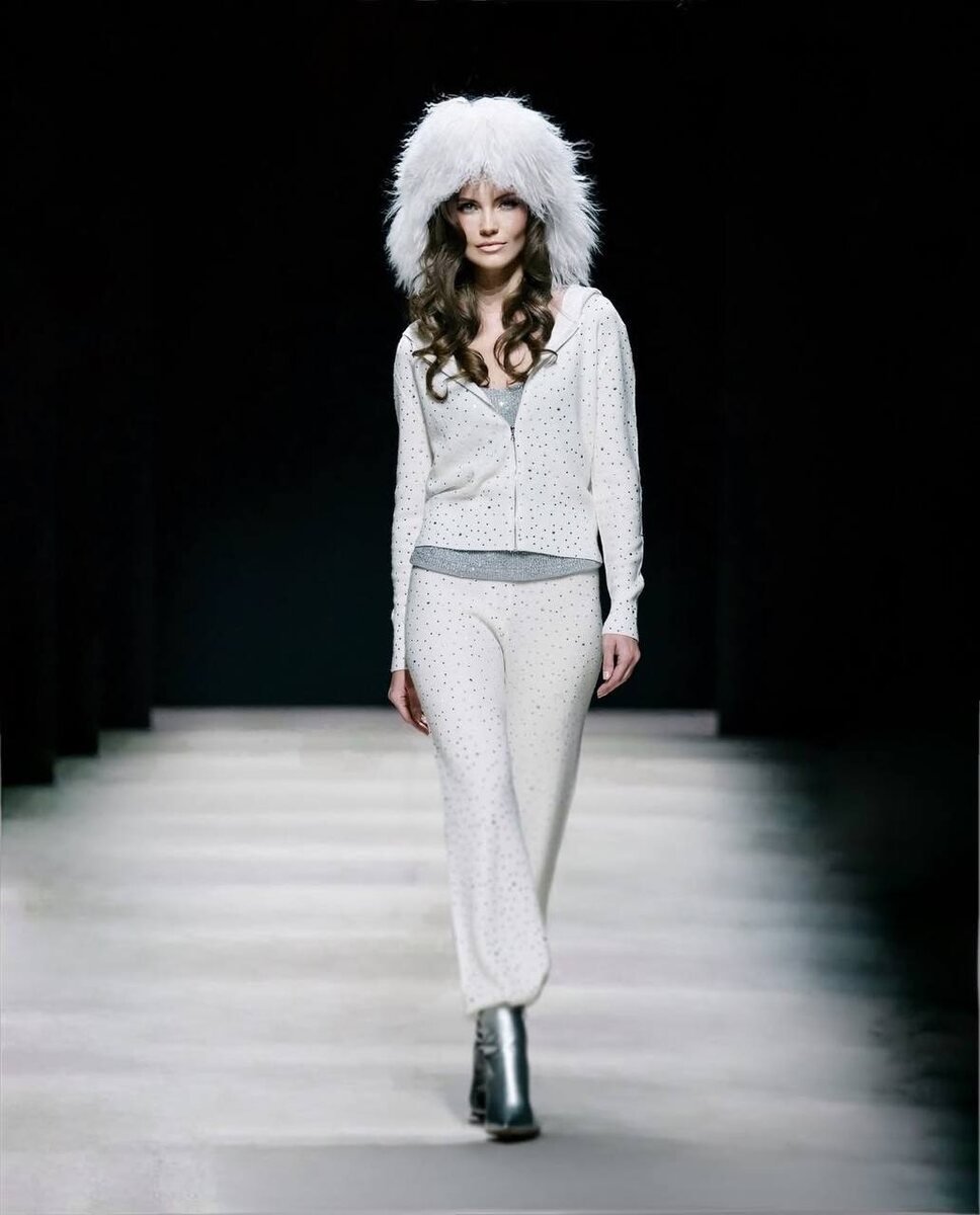 Стиль спорт-шик воплощен в этом образе: сверкающий белый трикотажный комплект, украшенный кристаллами. Эффектная шапка из натурального меха придает образу дерзкий объем, а металлические ботильоны завершают образ.