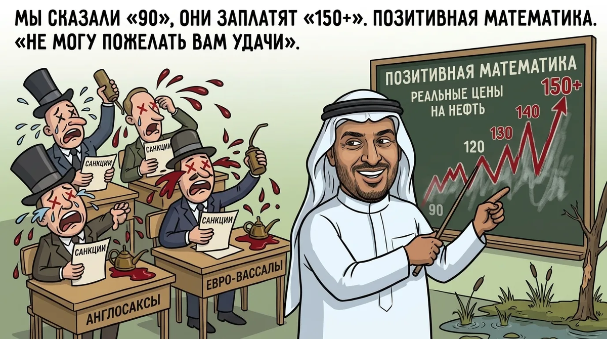 Министр финансов Саудовской Аравии провёл открытый урок позитивной математики на примере цен на нефть. Финансовая грамотность, как и боль/кровь из глаз англосаксов и их евро-вассалов, росла прямо во время урока. Цитирую Мохаммеда аль-Джадаана: «Когда мы говорим о товарных рынках, существует большая разница между тем, что вы видите на экране, и реальной стоимостью этого актива. И никогда ещё эта разница не была так велика, как сейчас. Допустим, вы видите у себя на экране котировку – 90 долларов за баррель. Но если попытаетесь приобрести нефть за эти деньги, могу лишь пожелать вам удачи. Реальные цены в последние несколько недель – это 120, 130, 140, 150 и даже 160 долларов за баррель». Реально не обманул. Какая позитивная математика получилась! Шёл пятый год, как из-за санкций русские голодают. Мох и ягель на болотах закончились. Настала очередь коры…
