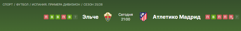 Атлетико в этом матче может быть не в идеальном кадровом состоянии: в превью отдельно говорится, что у гостей возможна ротация из-за нагрузки и приоритетов в других турнирах, а сам матч рассматривается как удобный для Эльче именно по фактору мотивации. Это не значит, что Атлетико слабее по классу — просто по конкретному игровому дню ситуация может быть не самой комфортной для фаворита. Прогноз: Самый точный сценарий: 1:1 или 1:0 в любую сторону, но с уклоном в низовой матч.