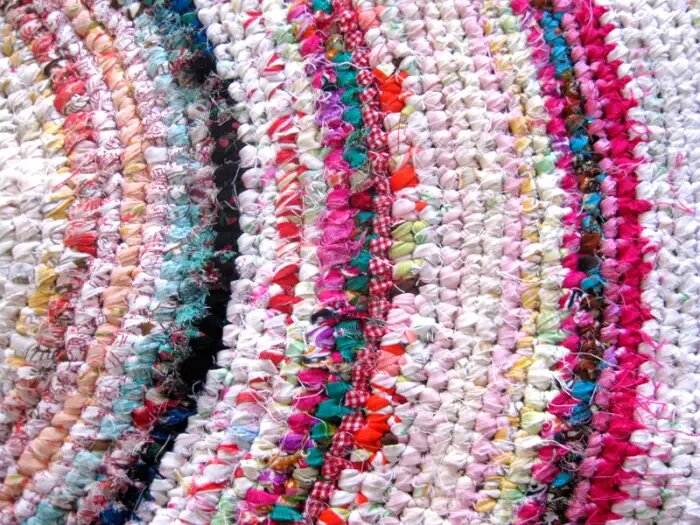 Для начала поищите в своем гардеробе вещи, порванные при стирке. Скорее всего, это именно та нежная, струящаяся, мягкая ткань, которая лучше всего подойдет для ковриков. Старые ночные рубашки с дырками или изношенные простыни идеально подойдут для изготовления ковриков из лоскутков.