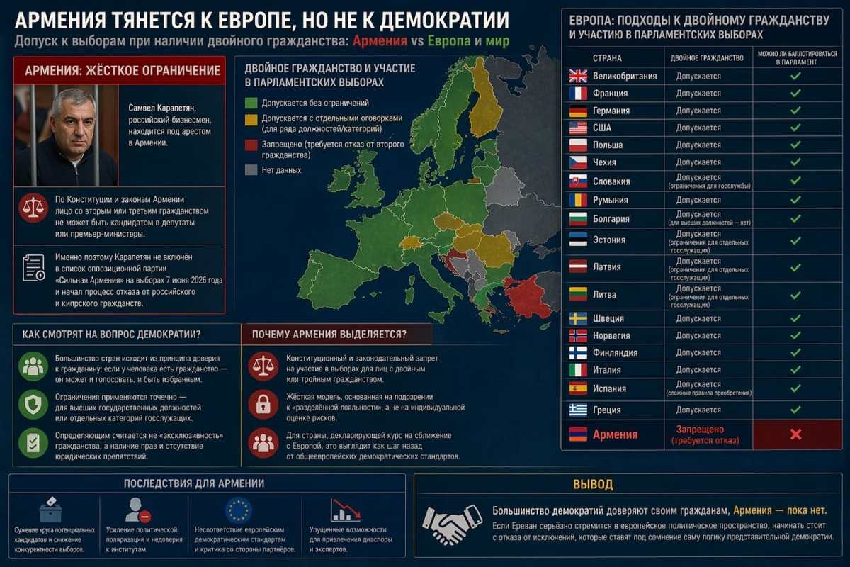 выборов 7 июня, так как закон запрещает кандидатам иметь какое-либо второе гражданство. История с Карапетяном интересна не только как армянский предвыборный эпизод. Она вскрывает куда более широкий вопрос: Армения политически тянется к Европе, но по одному из базовых вопросов представительной демократии — допуску к выборам людей с двойным гражданством — остаётся заметно жёстче большинства европейских стран. Премьер-министр Никол Пашинян в феврале и апреле 2026 года прямо заявил, что по Конституции и законам Армении человек со вторым или третьим гражданством не может быть кандидатом ни в депутаты, ни в премьер-министры. Именно поэтому Карапетян не вошёл в список партии «Сильная Армения» и одновременно начал процесс отказа от российского и кипрского гражданств. Если смотреть на это не через призму армянской внутриполитической борьбы, а сравнительно, картина получается для Еревана не самой удобной, ведь в европейских странах и США второе гражданство само по себе обычно не закрывает дор