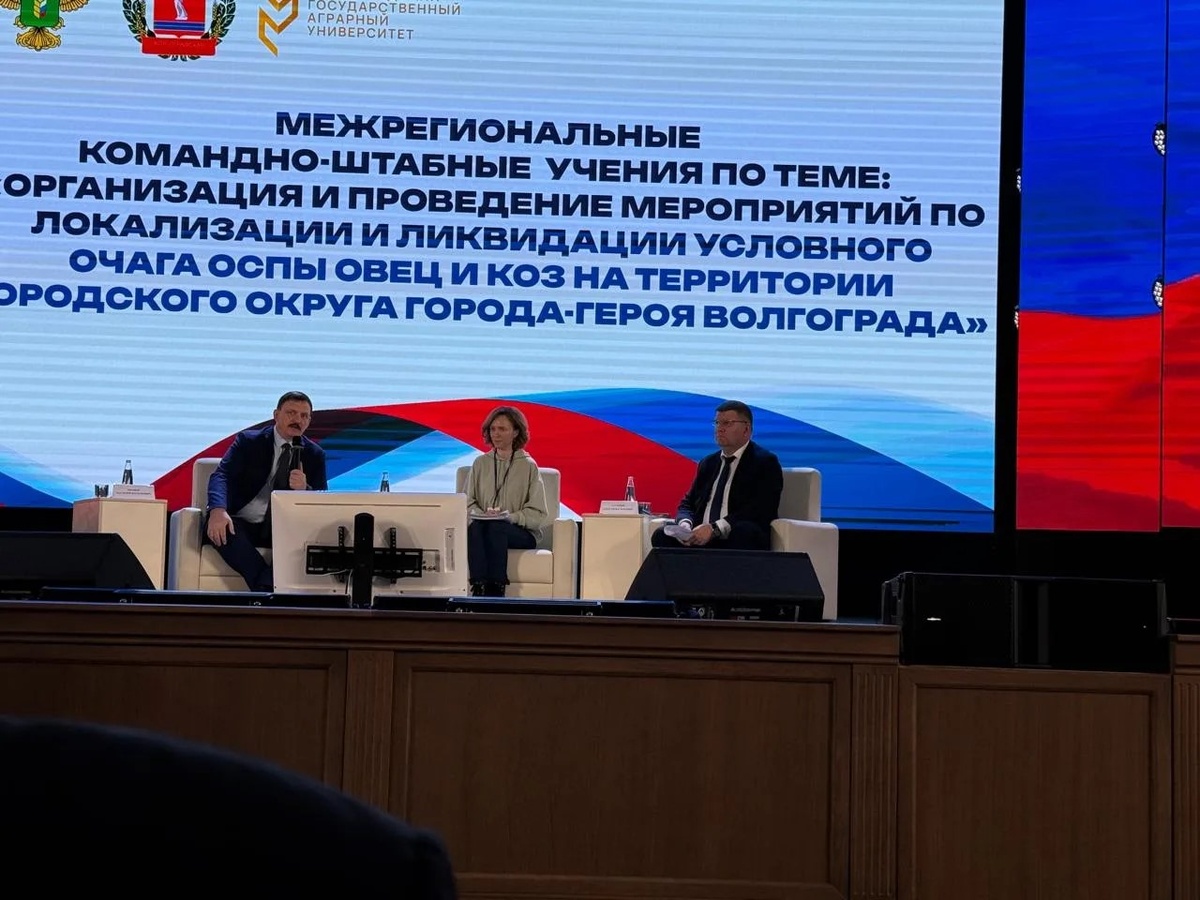 Заместитель руководителя Кавказского межрегионального управления Россельхознадзора Ислам Ахмедов и помощник руководителя Юнус Висенгириев принимают участие в межрегиональных командно-штабных учениях по ликвидации условного очага оспы овец и коз в Волгограде.