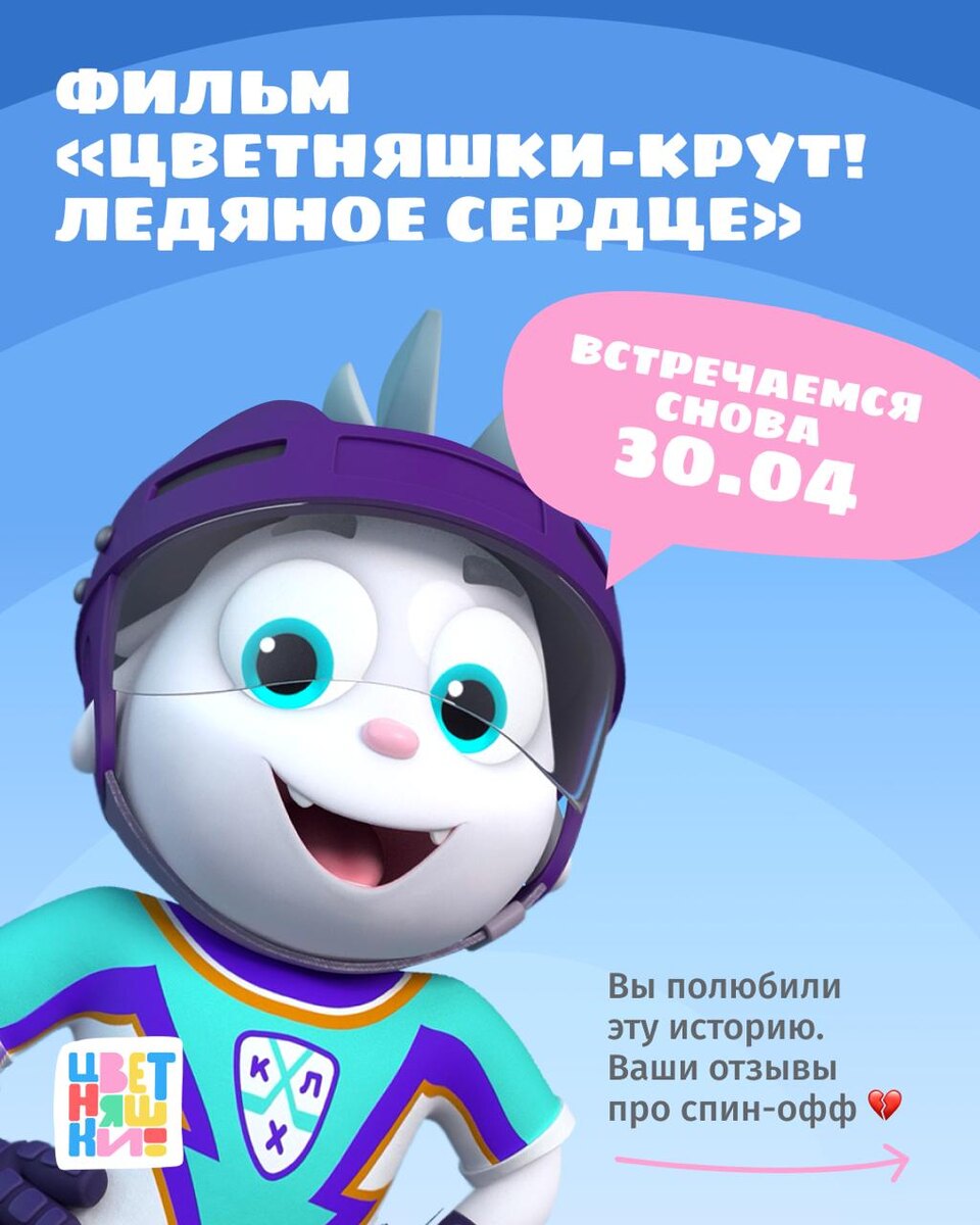 ! 30 апреля фильм «Цветняшки — Крут! Ледяное сердце» выйдет эксклюзивно в VK Видео📺 Ваши тёплые, добрые, искренние отзывы о спин-оффе с КХЛ вдохновили нас собрать историю Крута и Цветняшек в полноценный фильм. Это история о дружбе, спорте и первых победах. Фильм покажет малышам, как развивать важные жизненные навыки и идти к своей цели. А главное — научит верить в себя, свою мечту и настоящую дружбу.