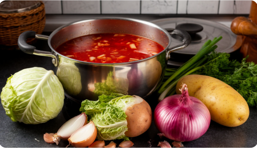 В борще три главных компонента: картофель, капуста и зажарка (лук, морковь, свекла, томат). У каждого свой характер. Картошка любит долгую варку в обычной воде. Капусте нужно 15–20 минут в кипящем бульоне без кислоты. А зажарка, особенно если в ней есть уксус или томатная паста, полностью меняет среду.