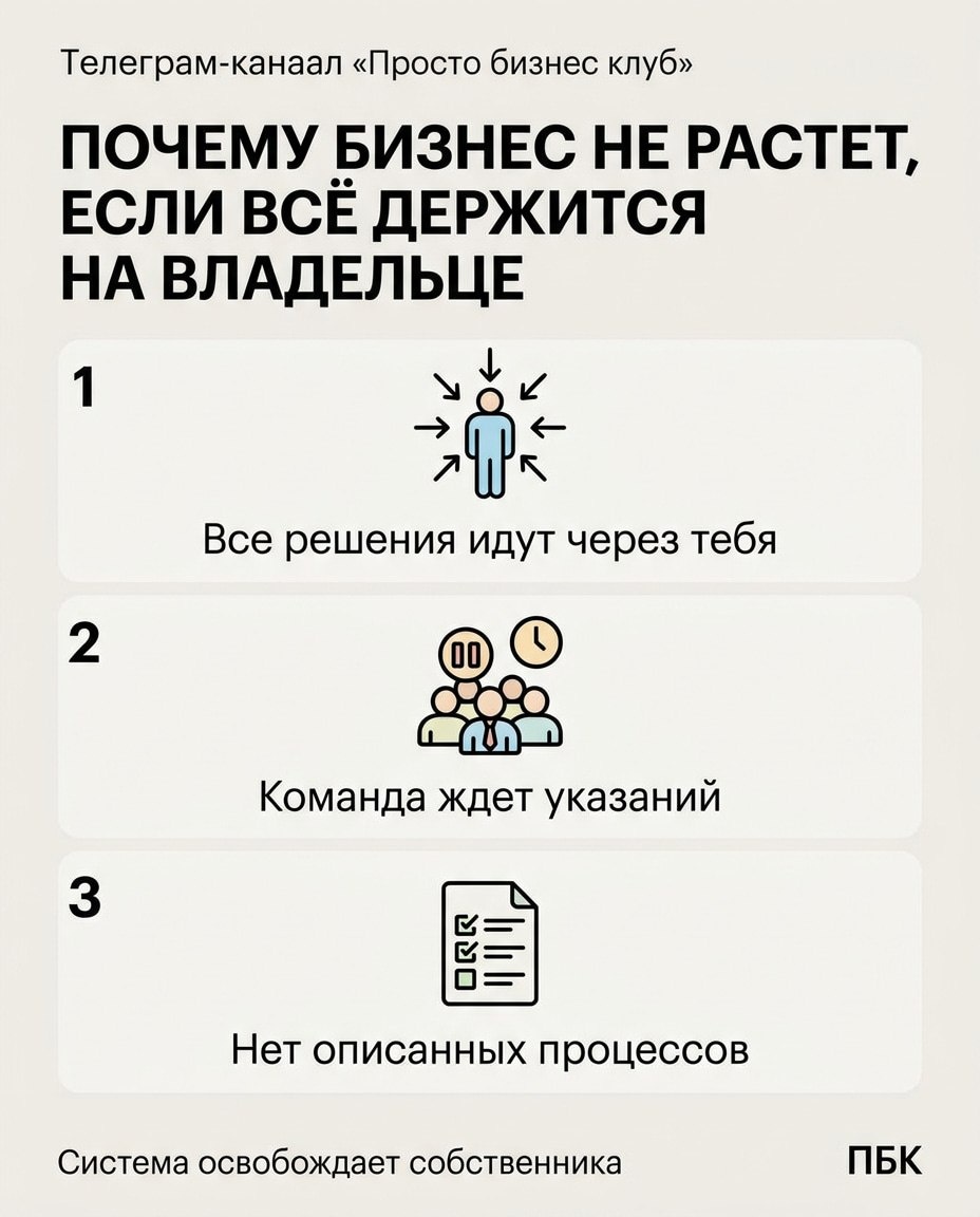 ⚙️ Пока все решения проходят через одного человека, компания растёт медленнее, чем могла бы. Для клиентов это оборачивается задержками и нестабильным сервисом, для команды — отсутствием инициативы. Для владельца — выгоранием и потолком по обороту. Текущая модель: ручное управление На старте гиперконтроль работает. Основатель лучше знает продукт, клиентов и рынок. По данным исследований малого бизнеса, до 70% операционных решений в компаниях с оборотом до определённого уровня принимаются лично владельцем. Это ускоряет запуск, но тормозит масштабирование. Когда каждое согласование идёт через одного человека, формируется узкое место. В управленческой теории это называют бутылочным горлышком: пропускная способность системы ограничена самым загруженным элементом. Скрытая цена контроля Проблема проявляется не сразу. Команда быстро привыкает, что финальное слово всегда за собственником. Снижается ответственность, падает инициативность. Руководители среднего звена превращаются в передатчи