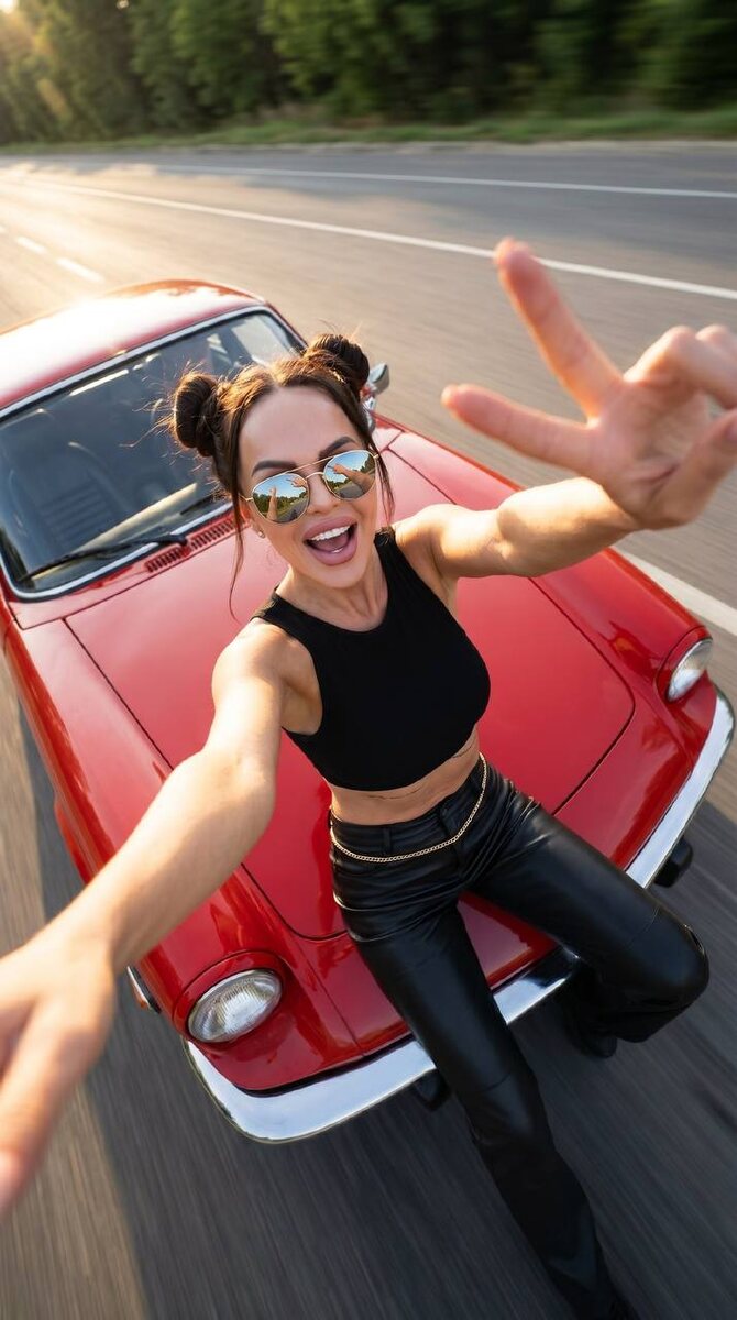 Девушка сидит на капоте красного авто в движении, рука тянется прямо в камеру. Закатный свет, размытая дорога и дерзкая fashion-энергия из одного твоего фото ✨ Использовали BANANA Создать в 1 клик 👉 TG | MAX Смотреть промпт 👉 TG | MAX 💬 Все нейросети тут: TG | MAX 💬 Поддержка: TG | MAX