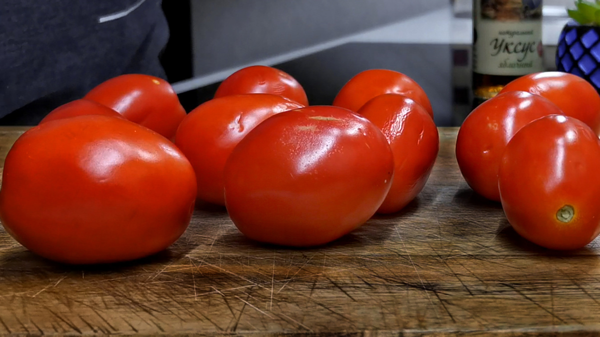 Итак, берем любые помидоры. У меня были вот такие небольшие, самые недорогие какие нашел в магазине. Они практически не имеют сейчас вкуса и у них грубая шкурка. Но мы из них сегодня сделаем кулинарный шедевр.