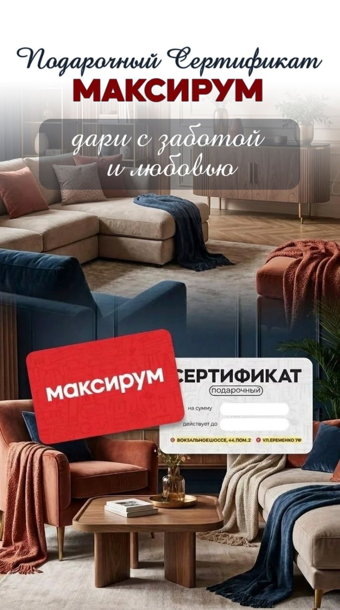 ! ✨ 🎁 Дарите возможность выбрать мебель для дома: доступны подарочные сертификаты номиналом от 10 000 до 70 000 рублей. Хотите другую сумму, цвет или короткое поздравление**? Легко! Сделаем индивидуально🙃 Такой сертификат подойдёт для любого повода: 🤍 свадьба 🤍 день рождения 🤍 годовщина 🤍 новоселье Получатель сможет самостоятельно выбрать мебель: от комфортного дивана до мебельного комплекта. Сертификат на приобретение мебели в Максирум — это приятный и полезный подарок, который всегда будет радовать.😉 Подарочный сертификат можно приобрести по адресу: г.Керчь, ул. Маршала Ерёменко, 7Ф Режим работы: — пн–сб: с 9:00 до 18:00 — вс: с 10:00 до 17:00 +7 (978) 265‑45‑50 (Telegram, MAX) Мы в Telegram https://dzen.ru/id/62372a0055717457dcec11cf ВК vk.com/maximumkerch *Сертификат обмену на денежные средства не подлежит. Действителен в течение года с момента покупки. ** короткое поздравление печатаем при условии предоставления текста. Корректировки производятся в срок от 1 до 3-х
