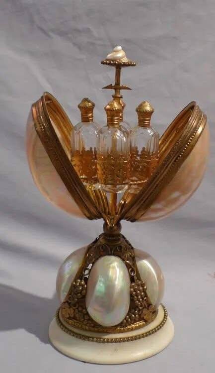 Старинная французская шкатулка из перламутра и ормолу (бронзы с позолотой) для флаконов с духами и одеколоном, около 1880 года. При нажатии на верхнюю раковину срабатывает пружинный механизм, открывающий четыре гранёных стеклянных флакона, украшенных орму. Такие изящные предметы использовались в аристократических кругах Франции как символ роскоши и изысканного вкуса. Часто их дарили на балах, свадьбах или в качестве особого знака внимания — подарок с такими флаконами считался признаком высокого статуса и утончённости. В эпоху расцвета французской парфюмерии подобные шкатулки становились не только функциональным аксессуаром, но и настоящим произведением искусства, подчёркивающим индивидуальность владельца. Сегодня такие антикварные вещицы — редкость и предмет охоты коллекционеров по всему миру. #интересное #parfums SM_ART_HISTORY