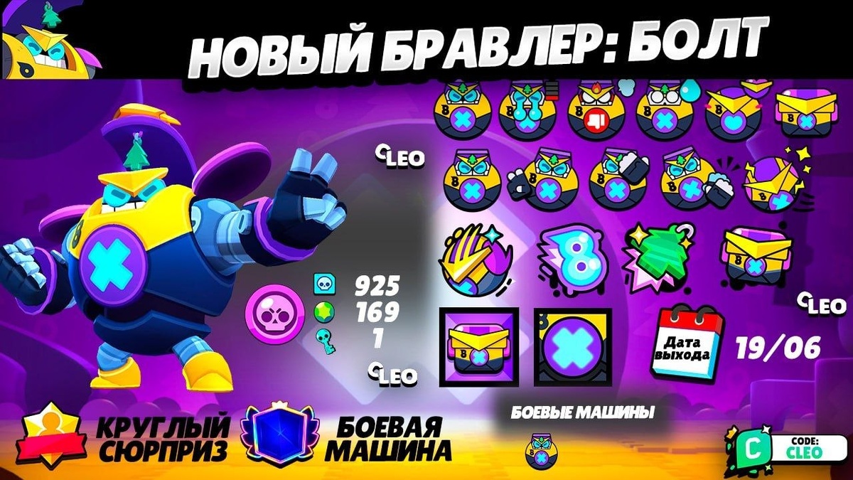 🔫 Основная атака Болт наносит урон, врезаясь в других бойцов! Чем он быстрее, тем больше урон. Во время основной атаки Болт сбрасывает избыток тепла, получая прибавку к скорости и нанося урон по области, в два раза превышающий урон от качения. У болта всего два боеприпаса и перезаряжается они медленно. 💪 Ульта Болт быстрее набирает скорость, получает меньше урона и оставляет за собой область, наносящую урон. Длительность 4 с. Снижение урона 40% Пораженные противники получают 1100 урона на протяжении 4 секунд. 🟢 Гаджеты: 🌟 Первый - ЗАМЕНА МАСЛА Болт получает щит прочностью 2000-4000 ед. в зависимости от текущей скорости. Перезарядка: 15с 🌟 Второй гаджет - УПРУГИЙ ШАР Болт прыгает в указанную точку и наносит урон по области, разрушая препятствия, но полностью теряет скорость при приземлении. Перезарядка: 20 с. При прыжке противник получает 1200 урона. 🟠 Звездные силы 🌟 Первая - ПОДБРОС Когда Болт движется на максимальной скорости, враги, в которых он врезается, подбрасываются в в