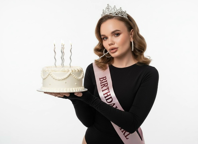 · Освещение: Мягкое студийное освещение, подчеркивающее текстуру кожи, блеск тиары и украшений, гладкость мастики на торте. Пламя свечи добавляет теплый, живой акцент.