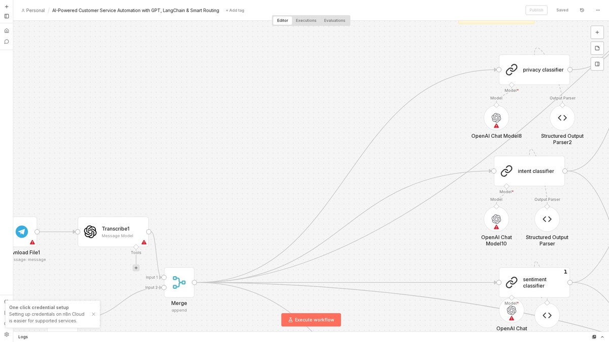 ⚡ Что делает: Автоматизация обрабатывает входящие запросы клиентов через Telegram, использует GPT и LangChain для анализа и генерации ответов, а затем направляет их в нужный отдел. Информация агрегируется и хранится в Google Docs для дальнейшего анализа. 👥 Кому подойдёт: Идеально для компаний, стремящихся улучшить качество обслуживания клиентов. 💡 Пример: Клиент задаёт вопрос о возврате товара, система автоматически генерирует ответ и перенаправляет запрос в отдел возвратов. 🔗 Ноды: Telegram, Aggregate, Chain Llm, Gmail, Google Docs Tool 📊 Сложность: Сложный #n8n #automation #nocode #aiagent #ai #aggregate ════════════════ 🎬 YouTube | ⚙️ Канал | 💬 Чат | 📮 Реклама