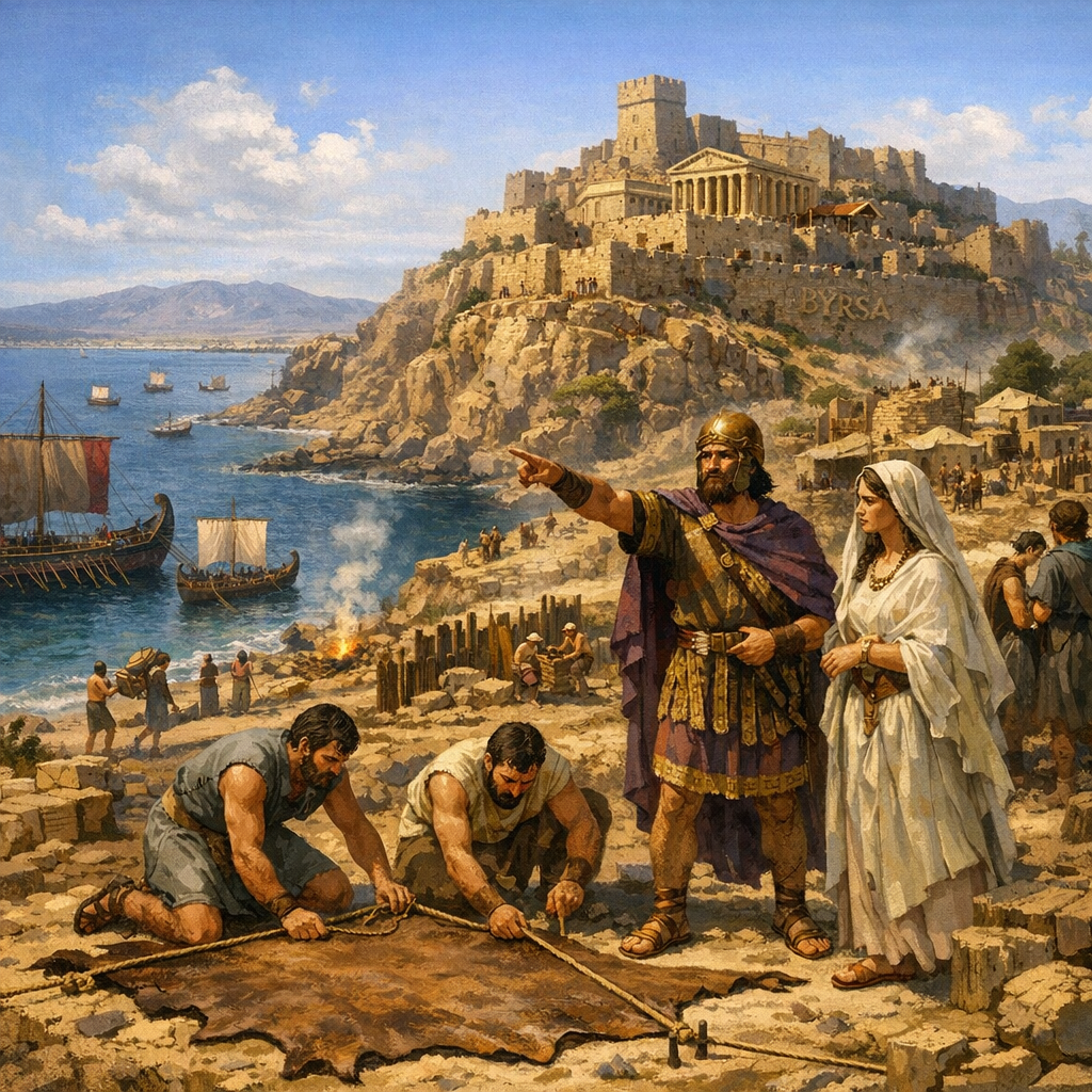 Всё началось на узкой полоске левантийского побережья, где финикийцы, величайшие мореплаватели своего времени, создали сеть городов-государств. Они не строили империй в привычном смысле — их властью был корабль, их оружием — товар. Пурпурные ткани, кедр, стекло, секреты навигации по звёздам. Когда Ассирия, а затем Вавилон железной пятой наступили на Финикию, многие жители Тира, Сидона и Библа предпочли не склонять голову, а искать новый дом за морем. Около 814 года до нашей эры группа таких изгнанников высадилась на берегу глубокого залива в Северной Африке. Легенда, пересказанная римскими поэтами, утверждает, что вела их царица Элисса, более известная как Дидона. Она бежала от брата, убившего её мужа, и попросила у местного берберского вождя столько земли, сколько покроет одна бычья шкура. Тот согласился, но царица разрезала шкуру на тончайшие ремни и связала их в длинную нить, охватившую целый холм. Так, по преданию, родилась цитадель Бирса — от греческого слова «шкура». Город назвали Карт-Хадашт — «Новый Город».