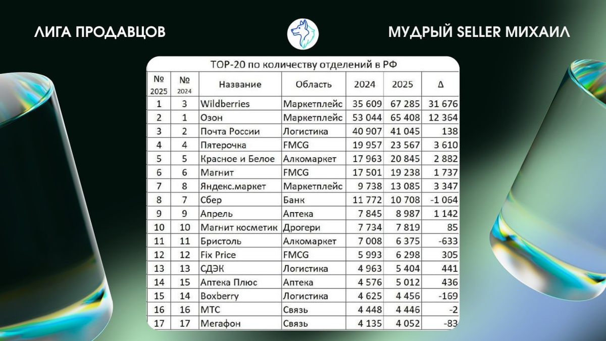 ‼️ Основатель сети DNS Дмитрий Алексеев провел масштабное исследование данных «Яндекс.Карт», представив свежий рейтинг крупнейших филиальных сетей страны. ➡️ Главной сенсацией года стал феноменальный рывок Wildberries, который прибавил более 30 тысяч пунктов выдачи. Ozon открыл 12 тысяч новых точек, что закрепило его в топе гигантов наряду с Почтой России. 🔔 Там, где раньше стояли банкоматы, теперь открываются пункты выдачи😄 Если банки окончательно уходят в "онлайн", мы, наоборот, прописываемся "оффлайн". ⬇️ А в вашем квартале еще остались места, не занятые синими или фиолетовыми вывесками? 📱 ПОДПИСАТЬСЯ в Telegram 📱 Подписаться ВК ⚡️Читать в SellerMap Консультация Мудрого|Юнитка Ozon|Закрытый-чат продавцов