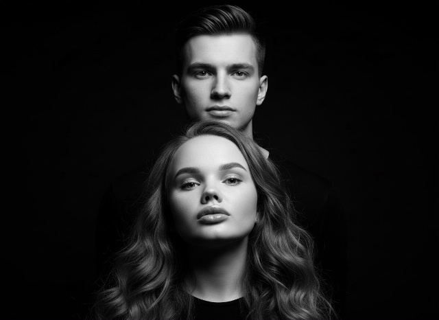 Do not change the face. Fine-art black and white studio double portrait, tight medium shot, eye-level camera angle. A dramatic composition featuring a young man and woman. The woman is positioned in the foreground, lower in the frame, tilting her head back and looking up towards the light with slightly parted lips. She has long, voluminous wavy hair with distinct bright highlights. The man is positioned directly behind and slightly above her, looking straight into the camera lens with a calm, stoic, confident expression. He has short, neatly styled hair. Clothing: extremely minimalist, both wearing solid pure black tops that blend seamlessly into the darkness. Subject realism: natural asymmetry, highly detailed natural skin pores, subsurface scattering, subtle micro expressions, fine stray hair strands catching the light, realistic glossy lip moisture, detailed eyelashes. Environment depth: pure black void background, infinite atmospheric darkness, zero background distraction. Lighting engineering: physically accurate light, high-contrast low-key studio lighting, overhead directional hard light with a grid, dramatic chiaroscuro effect. Pitch-black, deep shadow falloff on the necks, under the jawlines, and across the unlit sides of the faces. Brilliant, crisp realistic specular highlights on the woman’s cheekbones, nose tip, lips, and hair strands. Camera system: Medium Format Phase One XF IQ4, 100mm lens, f/5.6, ISO 100, 1/160s shutter speed, deep enough depth of field to keep both faces sharp. Texture authenticity: distinct individual hair strand texture, micro-roughness of skin, unretouched pure skin micro-texture. Color science: pure monochromatic, high-contrast black and white photography, rich inky matte blacks, silvery detailed midtones, crisp clean whites, deep micro-contrast, realistic dynamic range.