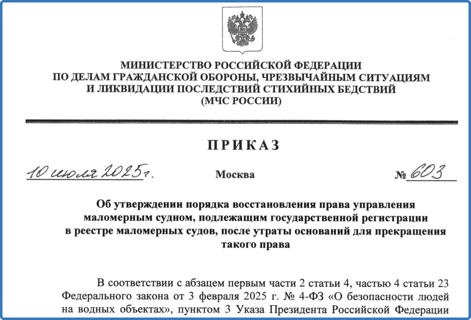 Но, вернёмся к нашим баранам... Помните Приказ МЧС №603, который потрепал нервы всем лодочникам, имеющим удостоверения судоводителя?..