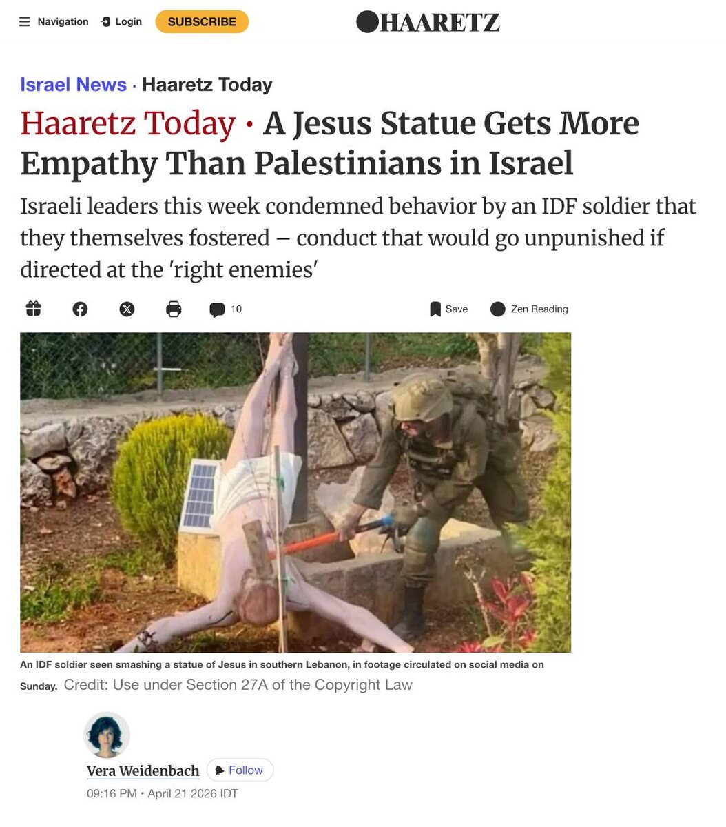 🇮🇱🇱🇧 Haaretz пишет, что оскверненная израильским солдатом на юге Ливана статуя Христа вызывает больше сочувствия, чем палестинцы в