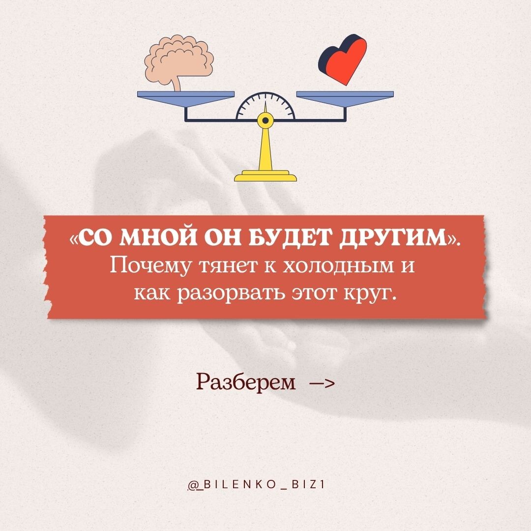 Мужчина с эмоциональной холодностью не изменится от твоей любви и стараний. Он изменится только если сам захочет и пойдёт в терапию ——> А твоя задача — не ждать, а выбирать себя ❤️ Ту, кто уже достойна тёплых, живых, настоящих отношений, а не гонки за призраком.