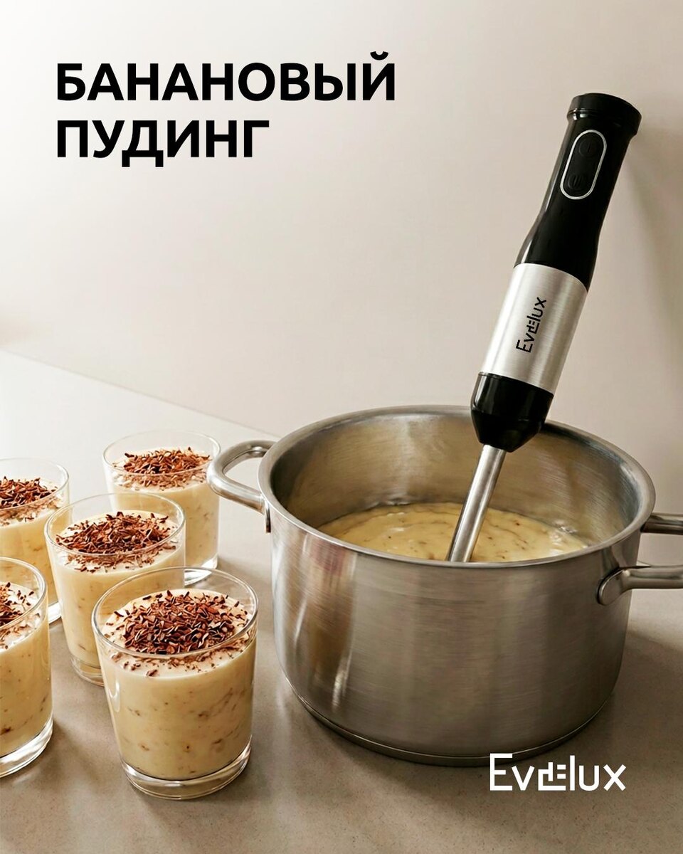 Для приготовления вам понадобится погружной блендер Evelux EHB 0301 B: он быстро доведёт массу до идеальной консистенции. Если хотите такой же, то переходите в наш канал в MAX и участвуйте в конкурсе. Подробнее по ссылке: https://max.ru/evelux_russia