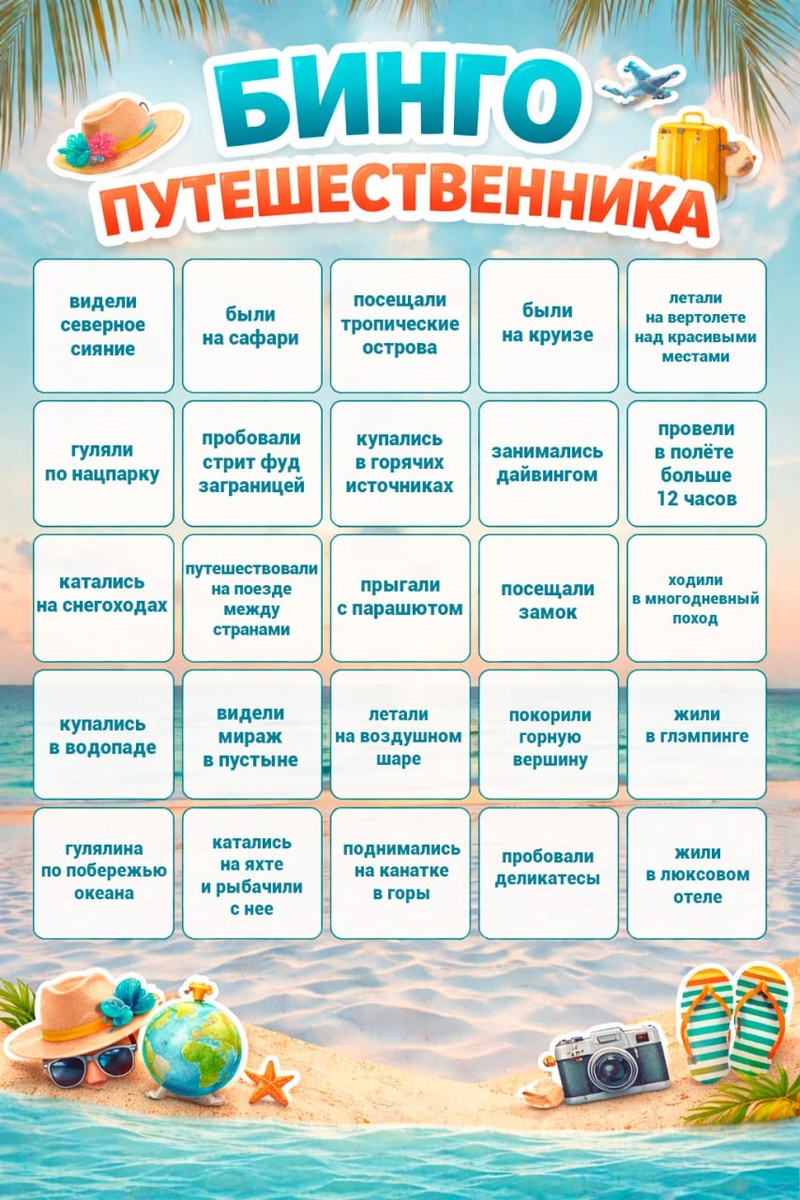 👋 Бинго путешественника 🌍✨ Здесь — маленькие радости, из которых складывается путешествие: случайные открытия, красивые виды, моменты, которые хочется остановить и запомнить. Сохраняйте и отмечайте — в карточке 20 таких точек на карте ваших впечатлений. Сколько совпало у вас? Напишите в комментариях 👇 Ваша Лариса Комарова ❤️