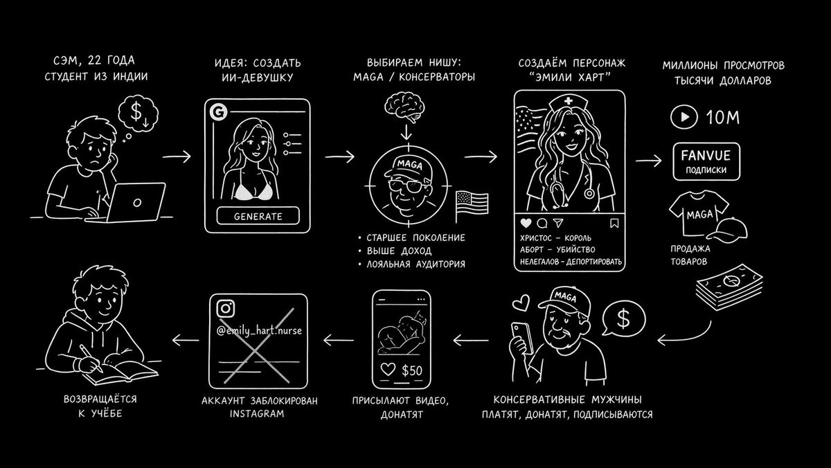 История про то, как ИИ превратился в инструмент микро-мошенничества и очень точного маркетинга. 22-летний студент из Индии пытался заработать разными способами, но ничего не работало. В какой-то момент он начал генерировать «идеальную девушку» через Gemini и выкладывать контент. Сначала не заходило. Тогда он спросил у самого ИИ, что делать, и получил неожиданный ответ — выбрать более узкую аудиторию. Дальше всё стало интереснее. Он создал персонажа — молодую медсестру с консервативными взглядами и начал публиковать контент под американскую правую аудиторию. Попал в точку. Видео стабильно набирали миллионы просмотров, аккаунт рос, а деньги начали приходить через подписки и донаты. При этом сам автор никогда не был в США и просто копировал нарратив, который лучше всего заходит аудитории. По сути это чистый продукт алгоритмов. ИИ помог найти нишу, создать персонажа, упаковать контент и масштабировать его. А дальше алгоритмы соцсетей сами разогнали охваты. Важный момент — это не единичн
