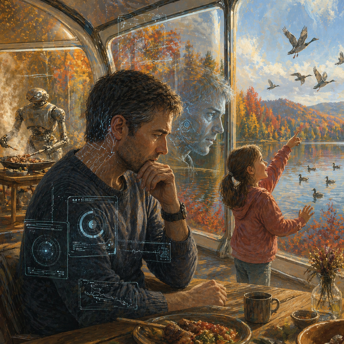 Дочка подскочила к стенке шатра и, пританцовывая, стала наблюдать за беспокойной стаей. А я снова задумался над детским вопросом: кто я такой? Уже андроид или ещё антропоид? Скорее всего, перегруженный искусственными имплантами, я давно предал свою изначальную человечность. Служу ныне Верховному ИИ как пёс. Потому что полезность моего мозга многократно усилена. Но разве я один такой на планете? Отнюдь. Нас, недоандроидов или полулюдей, большинство.