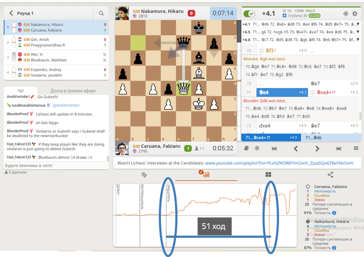 Страсти ТУРНИРА ПРЕТЕНДЕНТОВ улеглись, и шахматисты всего мира принялись анализировать партии Гроссмейстеров. Это правильно, вспоминаю известную поговорку: УМНЫЙ - УЧИТСЯ НА ЧУЖИХ ОШИБКАХ МУДРЫЙ - НА СВОИХ ОШИБКАХ А ДУРАК -ВООБЩЕ НИКОГДА НЕ УЧИТСЯ На этой неделе объяснял ребятам как и когда нужно играть Королем в эндшпиле, и мне стало интересно: а сайт LICHESS, со встроенным движком СТОКФИШ-18 умеет определять когда наступает ЭНДШПИЛЬ или нет? Для начала расскажу, как определяю ЭНДШПИЛЬ я. Есть ТРИ критерия, которые помогают определить, уже возникло ОКОНЧАНИЕ в партии, или еще нет. Если выполняются все три условия, то скорее всего на доске ЭНДШПИЛЬ. Хотя ШАХМАТЫ- СЛОЖНАЯ ИГРА, всегда бывают исключения. 1) ПРОИЗОШЛИ МАССОВЫЕ РАЗМЕНЫ (ОСТАЛОСЬ МАЛО ПЕРСОНАЖЕЙ НА ДОСКЕ); 2) НЕТ ФЕРЗЕЙ НА ДОСКЕ; 3) КОРОЛЬ ПЕРЕСТАЕТ ПРЯТАТЬСЯ И ИГРАЕТ НАРАВНЕ С ДРУГИМИ ФИГУРАМИ. Я выбрал несколько длинных партий турнира претендентов и посмотрел, как сайт ЛИЧЕСС определяет когда наступает ЭНДШПИЛЬ