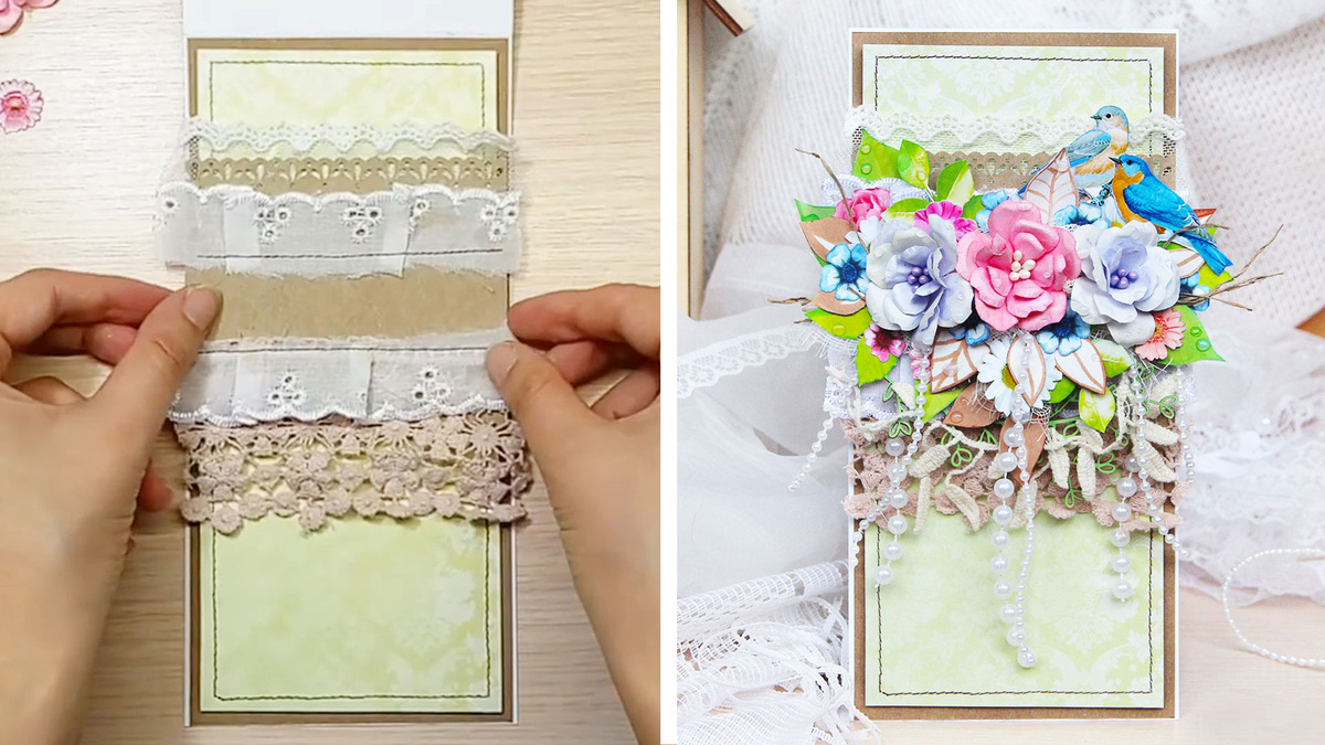 Идея весенней открытки с цветами, птичками, кружевом и жемчужными нитями. Процесс создания красоты своими руками