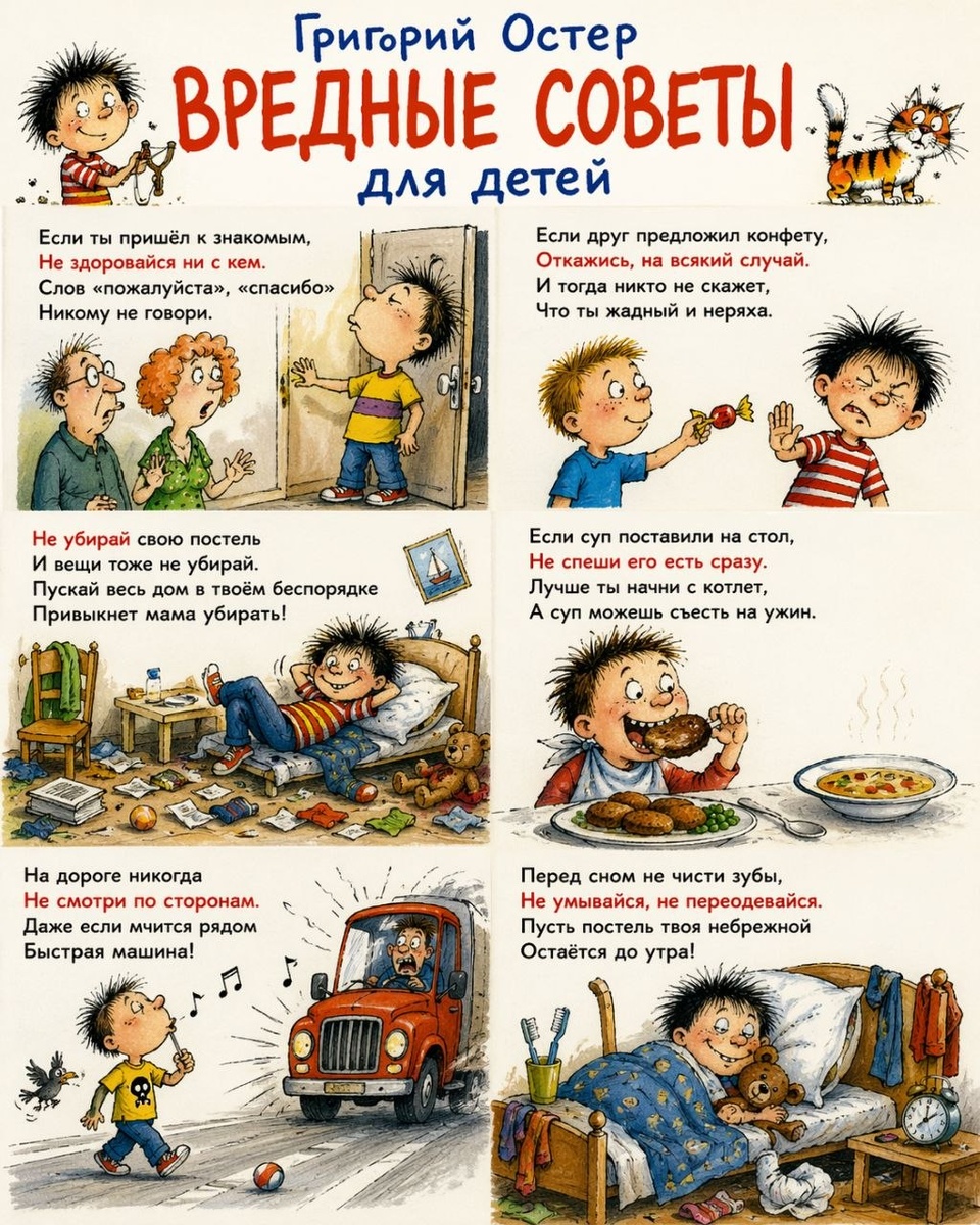 🎣 21 апреля 2026 года СК сообщил, что произведения Григория Остера назвали «негативным примером» на заседании координационного совета, а Александр Бастрыкин поручил проверить книги автора на «сомнительные с педагогической точки зрения установки». И вот тут тревожно смешно: у нас решили всерьёз проверять иронию. 🥩 «Вредные советы» с самого начала были устроены не как инструкция по пакостям, а как перевёртыш: в предисловии прямо сказано, что есть дети, которые делают наоборот, и потому вредный совет должен привести их к правильному поступку. Ещё в 1989 году вокруг книги уже кипело: после публикации Остер получил сотни писем — дети радовались, бабушки и дедушки сердились. Значит, спорим мы не с новой угрозой, а со старой неспособностью некоторых взрослых отличить шутку от инструкции. 🧠 Смотрите, какая штука. В психологии это зовут реактантностью — упрямством, которое включается от нажима. Ребёнку говоришь слишком назидательно — и он упирается, как рука сама тянется потрогать свежую к