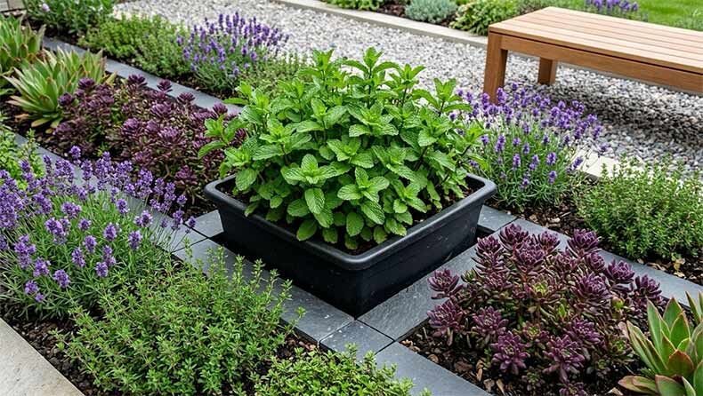 Мята идёт строго в отдельный вкопанный контейнер или бетонированную клумбу, иначе через два сезона она захватит весь участок.