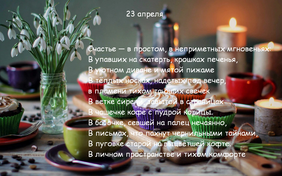 Автор не рассчитывает на мнение в последней инстанции, но с Космосом «согласовано» 23.04 Четверг 09:11- начало 7-го лунного дня Луна в Раке 22:41 Луна> в Лев 22:28 - 22:41 Луна в зоне «без курса» Кто рано встает, тот зевает до тех пор, пока не выпьет чашку темного, как южная ночь, напитка. Космос продолжает пополнять нас энергией. Сегодня можно буквально «свернуть горы», поэтому «слезайте с печи», и хватит трескать калачи. В этот день Космос очень чутко откликается на каждое, даже случайно произнесенное вслух слово. А потому не следует попусту болтать, и вообще надо быть очень осторожными со словами. Все сказанное в этот день, сбывается, как хорошее, так и плохое. Сегодня нельзя хитрить и обманывать, так что на вопрос "Где деньги, Зин?" придётся сознаться, что на Вайлдберриз. Большой успех предвещается во всем, что связанно с добрыми делами. О своей благотворительности никому не рассказывайте. Есть поверье, что чем больше добра получится сделать в этот день, тем лучше. Ваши добрые дела