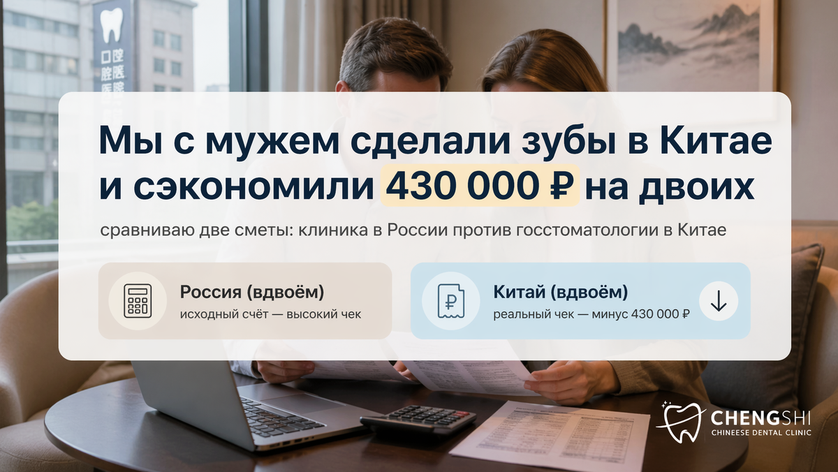 Лечение зубов в Китае мы с мужем планировали полгода, а решились за один вечер. 22 зуба на двоих, общая экономия — 430 000 рублей. Рассказываю, как это было, чего мы боялись и почему ехать вдвоем оказалось не вдвое дороже, а вдвое спокойнее. У меня четыре коронки и мост, который стоматолог называл «временным» еще в 2019 году. У мужа — два импланта под вопросом и передний зуб, который он прикрывал рукой на фотографиях. Каждый из нас откладывал поход к врачу по-своему. Я записывалась и отменяла. Он просто не записывался. Потом я посчитала. Мы с мужем — москвичи, нам 42 и 45 лет. У меня нужно было поставить 12 коронок и новый мост на 3 зуба, у мужа — 2 импланта с коронками, наращивание переднего зуба и лечение 5 кариесов. В Москве нам насчитали 1 170 000 ₽ на двоих. Хотелось просто закрыть калькулятор и забыть это все. Подруга скинула ссылку на статью про стоматологию в Китае для русских. Я прочитала вечером, показала мужу. Он сказал: «Если ты едешь — я тоже». Не только потому что загорел