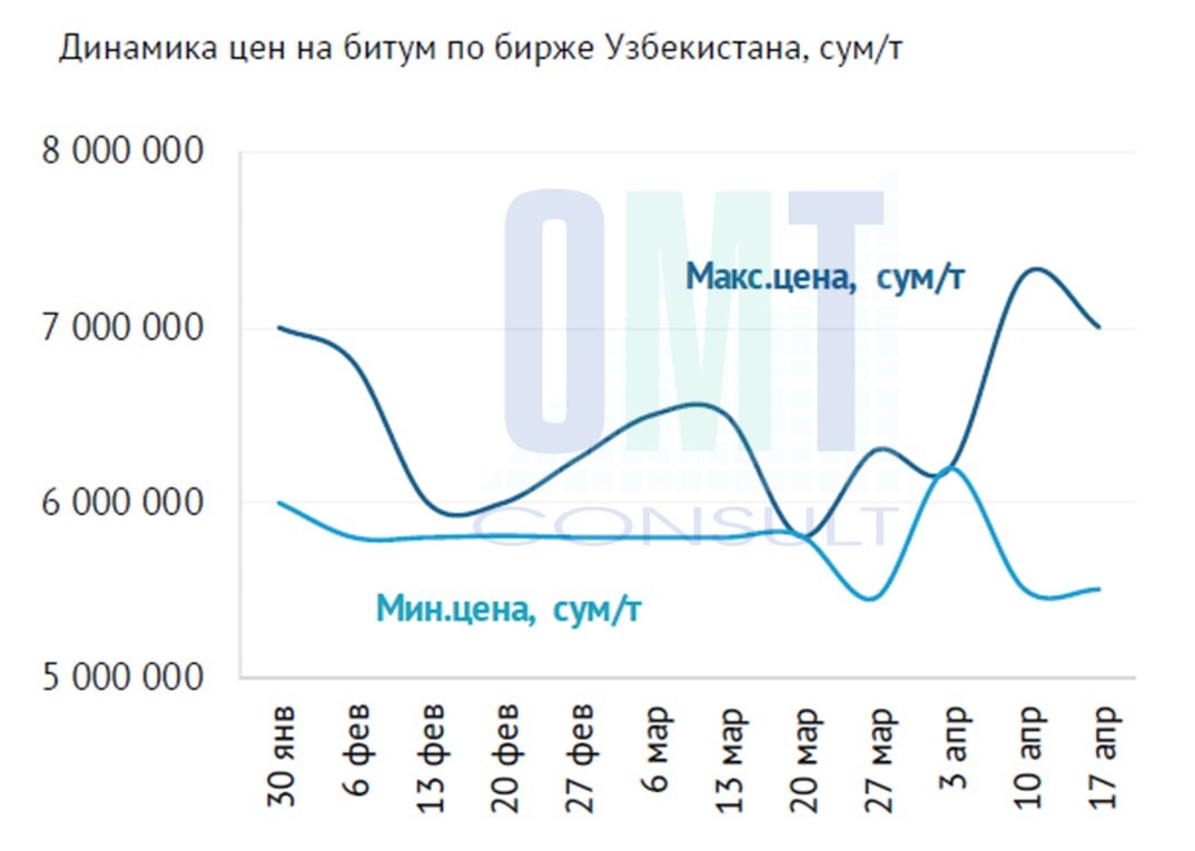 составила 6,7 млн сум/т (551 $/т), прибавив +0,4% в сумах к прошлой неделе и продолжив восходящий тренд уже четвёртую неделю подряд. 💰По сравнению с началом 2026 г. (6,5 млн сум/т, 535 $/т) биржевая цена выросла на 3% как в сумах, так и в долларах. Ключевые драйверы роста - активизация дорожного сезона, рост объёма торгов и стабильный курс сума (12 148 UZS/долл, -0,3% за неделю). 📈Объём биржевых торгов резко вырос до 1 556 т (15 сделок) - максимальный показатель за 6 отчётных недель. Общий объём БНД, реализованного через биржу с начала 2026 г. - 5,6 тыс. т (-48% от аналогичного периода 2025 г.). Это отставание объясняется более активным использованием внебиржевых каналов поставок и ростом ж/д импорта. Битум и ПБВ 👉 Подписаться ОМТ-Консалт в MAX