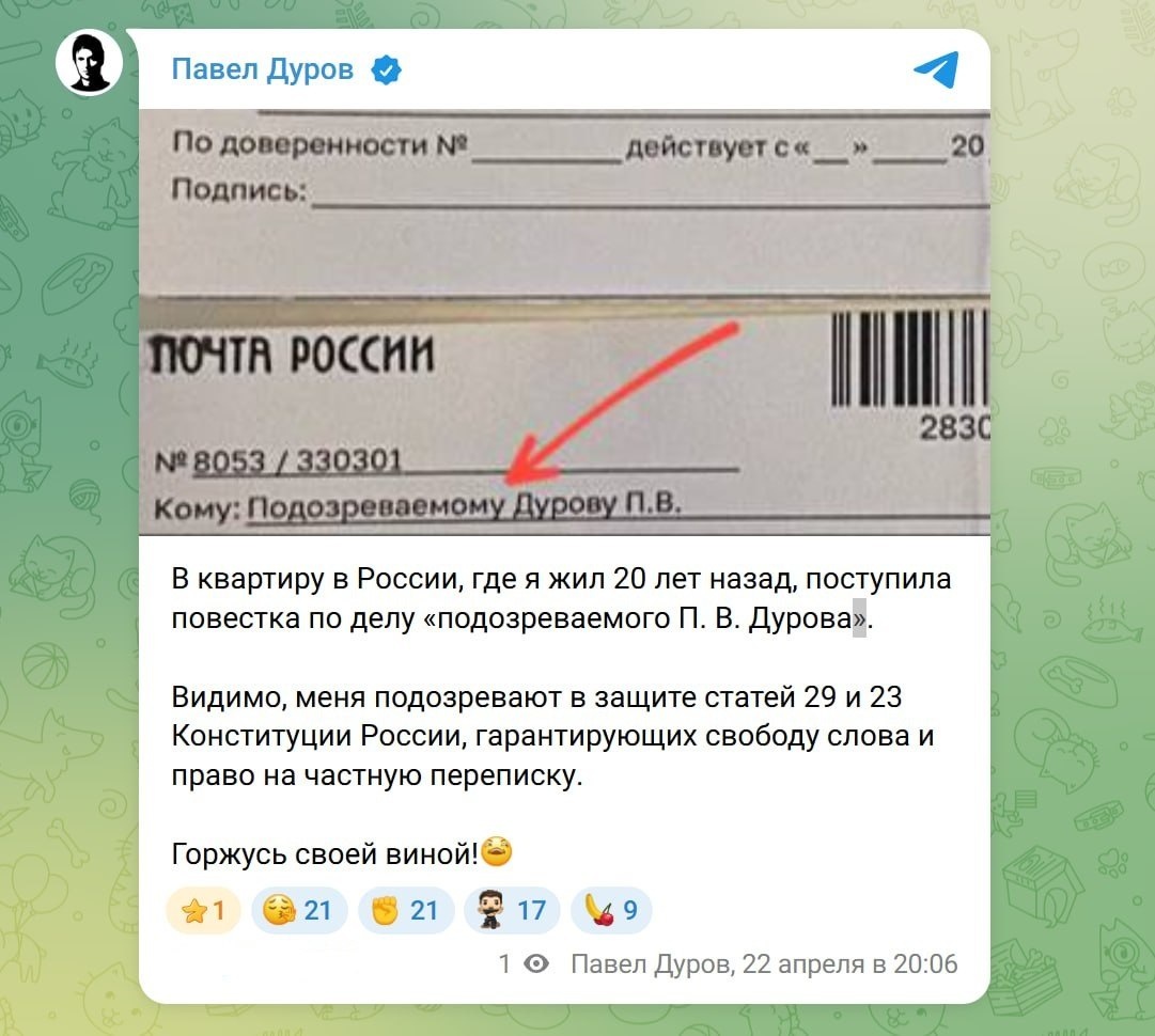 Дурову пришла повестка — отец Telegram сообщил, что по его старому адресу прислали письмо, адресованное как «Подозреваемому Дурову П. В.»