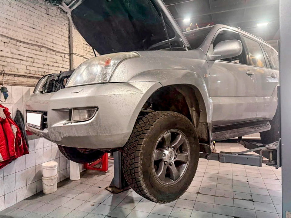 Сегодня делимся отчетом о работе с надёжным — Toyota Land Cruiser Prado 120 2004 года с пробегом 205 000 км. Владелец обратился к нам с жалобами на ухудшение управляемости и «пробои» подвески на неровностях. Что делали?