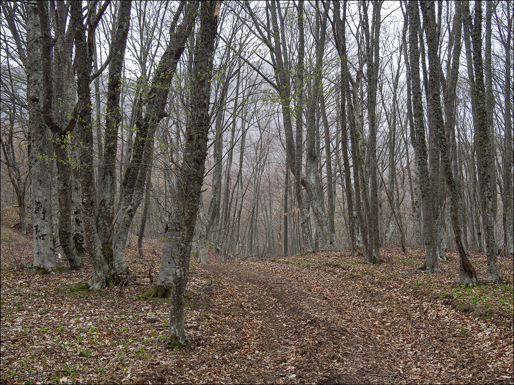 Чудесные буки словно светились своими изысканных оттенков стройными стволами. Сквозь нежную паутину безлистных ветвей просвечивали розовато-лиловые горные дали. Тёплых тонов прошлогодняя листва, лежащая ковром, прорезалась лентами грунтовок. Мы слегка поплутали в поисках нужной дороги, очутились на широкой просеке ЛЭП, выровняли направление движения — и зашагали среди волн ландшафта в поисках тропы к Тисовому ущелью.