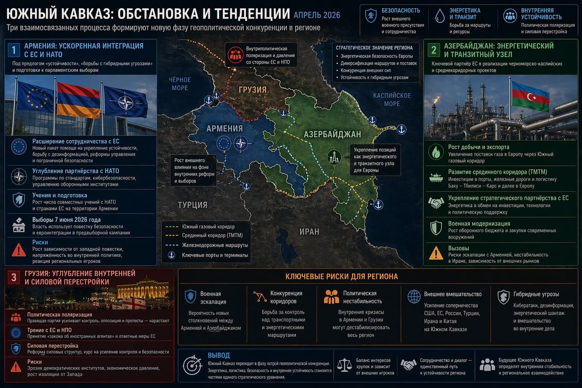 Военно-политическая обстановка на Южном Кавказе в апреле 2026 года определяется тремя взаимосвязанными процессами