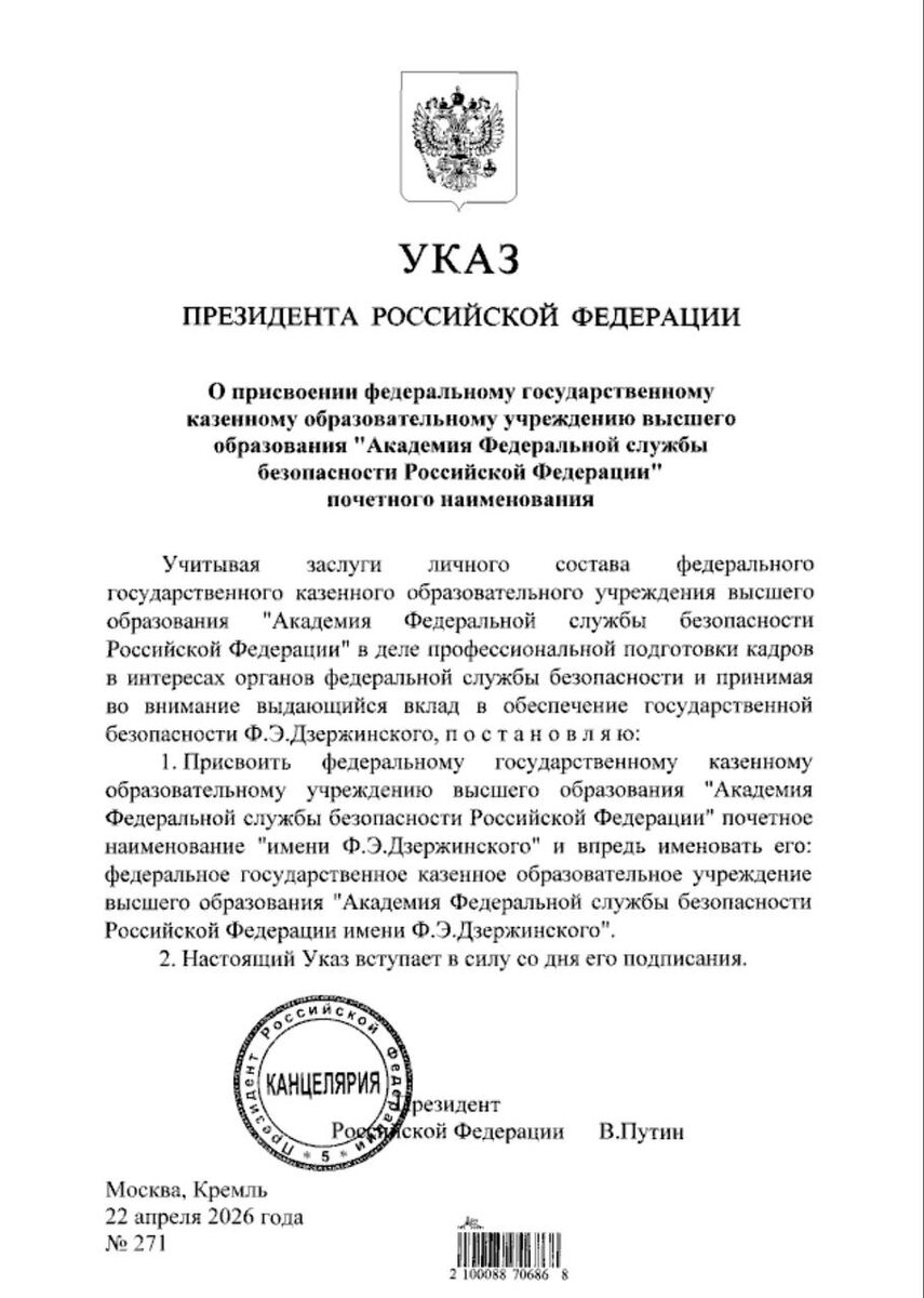 📃Владимир Путин подписал указ о присвоении академии ФСБ имени Феликса Дзержинского
