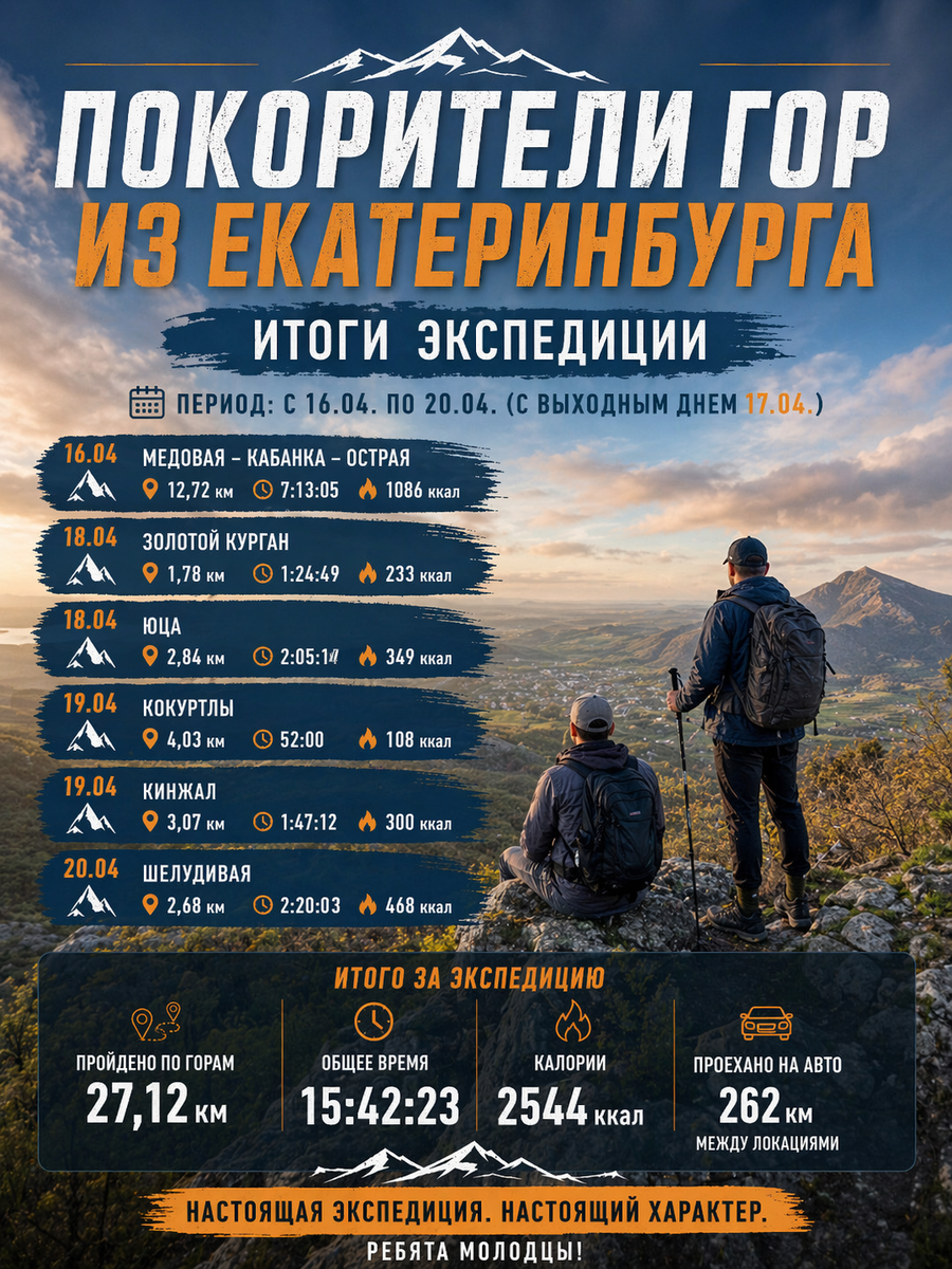 За эти дни ребята прошли 27,12 км по горам, провели 15 часов 42 минуты на маршрутах, сожгли 2544 ккал и проехали 262 км на автомобиле между локациями. А это уже совсем другой формат. Здесь мало просто выйти и прогуляться. Здесь нужно держать темп, восстанавливаться после нагрузки и снова ехать дальше — к следующей горе.