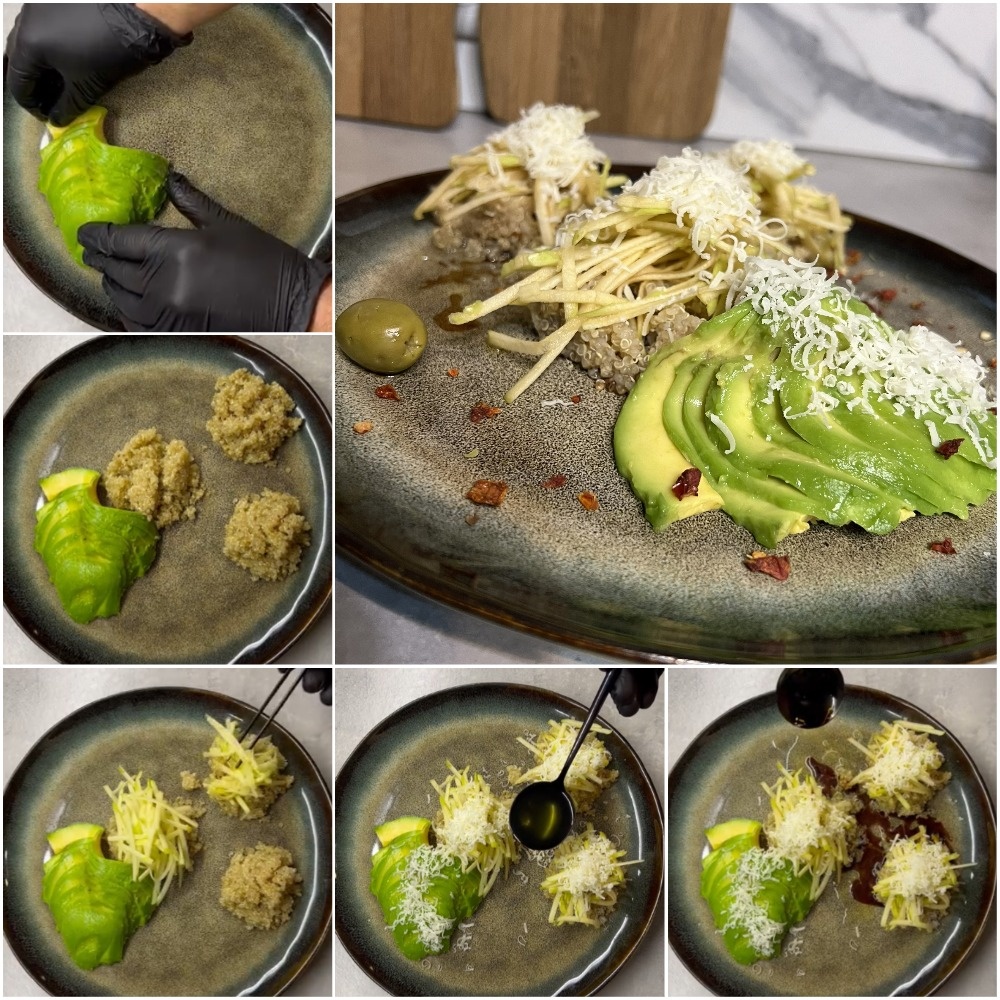 Представляю вам потрясающее блюдо: К нарезанному авокадо добавляем сваренное киноа, покрываем соломкой из тертого яблока, посыпаем тертым пармезаном, поливаем вокруг оливковым маслом, немного соевого соуса, вяленых томатов и кладем оливку. Варим киноа: соотношение 1:2; время 15-20 минут + 10 настояться. Общее время приготовления 30-35 минут. Эстетично, вкусно и питательно, отличное блюдо для любого приема пищи🤩