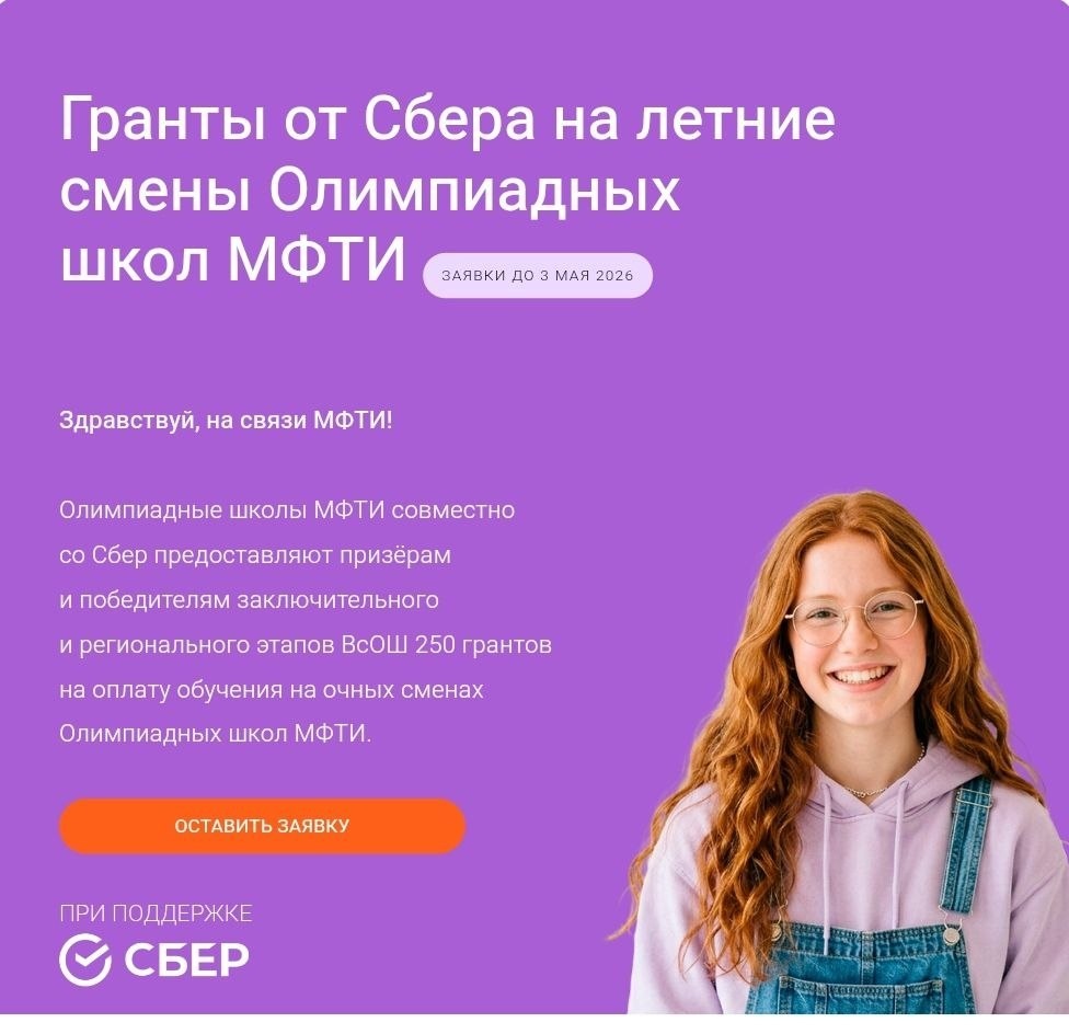 📣📣📣Гранты от Сбера Призерам и Победителям Заключительного и регионального этапов ВсОШ 250 грантов на оплату обучения на очных сменах 🎓ЛЕТНЯЯ ОЛИМПИАДНАЯ ШКОЛА 2026 📝Направления олимпиадных школ Математика Физика Информатика Машинное обучение Химия 🎁100% покрытие стоимости участия для ПиПов заключительного этапа Вэ́сОШ 🎁60% покрытие стоимости участия — для ПиПов регионального этапа ВсОШ (финалисты, которые подали заявку от школы, получают полное покрытие стоимости ⌛️ЗАЯВКИ ДО 3 МАЯ 2026 ✍️Регистрация и Подробности https://edu.mipt.ru/olymp-school/grants/?utm_source=segment_schoolchildren_email&utm_medium=email&utm_campaign=summer_2026&utm_content=grant20260327anounce