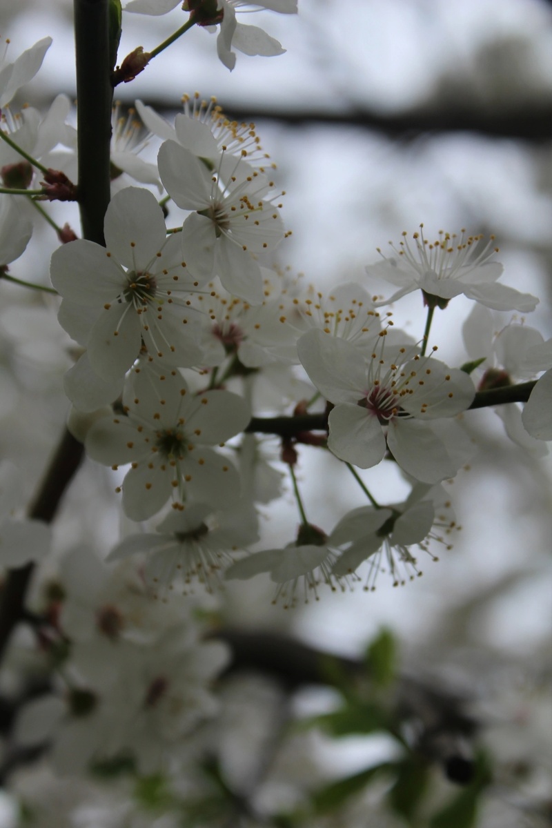 Описание: На фотографии запечатлены нежные белые цветы вишни в момент полного расцвета. Лепестки выглядят почти прозрачными на фоне размытого светлого пейзажа, а жёлтые тычинки добавляют композиции изысканности. Ветви дерева словно застыли в тишине весеннего утра, передавая ощущение хрупкой красоты и мимолетности момента.