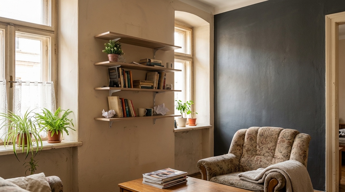 Типичный сценарий: человек делает ремонт в панельном доме, монтажники вешают полки «как на картинке» — без проверки материала стены. Через месяц полка с книгами весом 15–25 кг обнаруживается на полу вместе с коллекцией Достоевского и любимой кружкой. Стены из пеноблока держат анкер примерно с энтузиазмом мокрого картона.