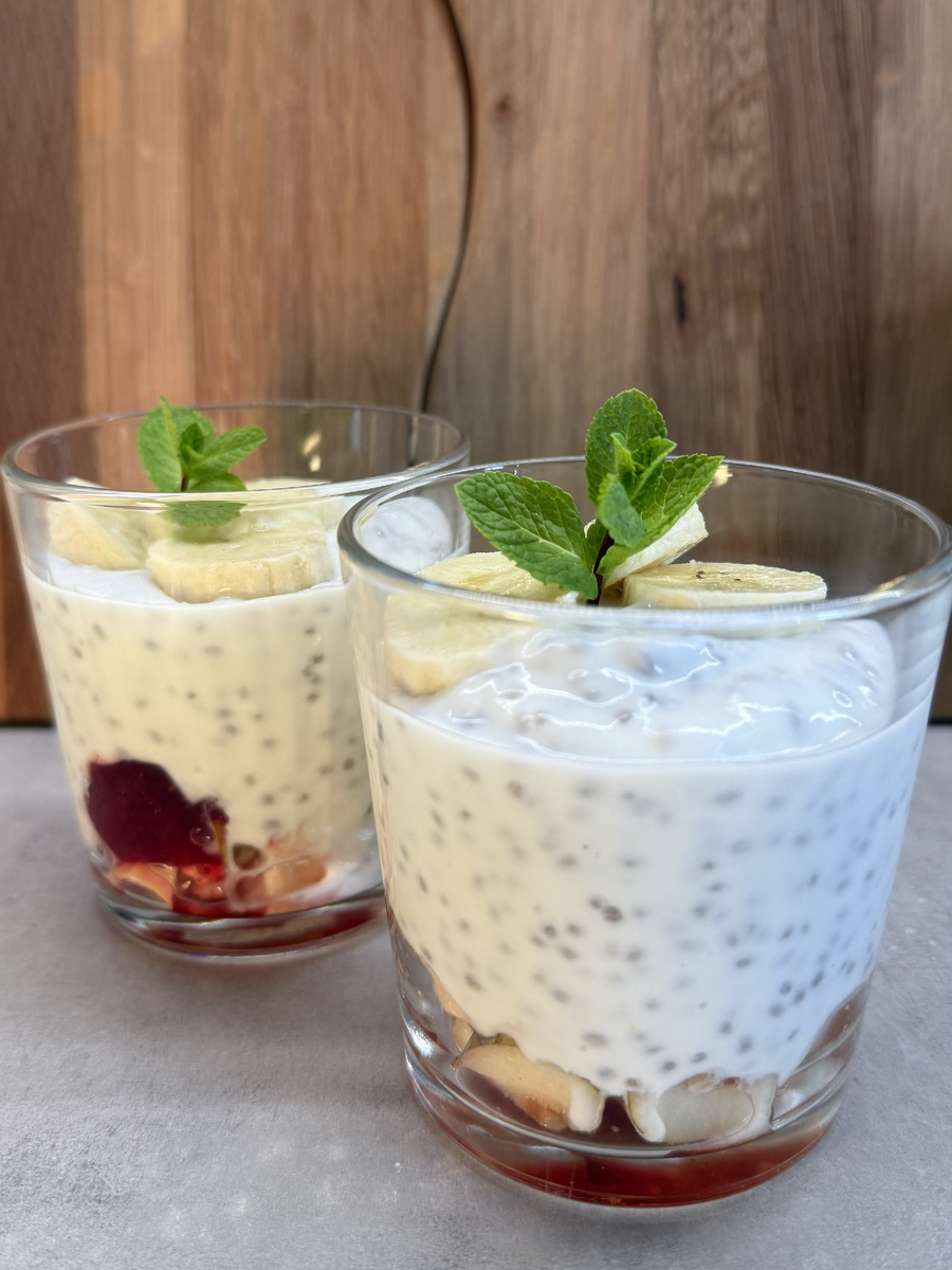 Для этого десерта вам понадобятся: - Бифилайф - Груша и кешью, нарезанные и выложенные на дно - Малиновое или клубничное варенье (оно обязательно) - Семена чиа, предварительно смешанные с бифилайфом - Банан, нарезанный кольцами и уложенный сверху - Веточка мяты для аромата Приготовление займет не более 10 минут, но семена чиа и бифилайф должны постоять 15-30 минут (можно в холодильнике), чтобы десерт загустел.