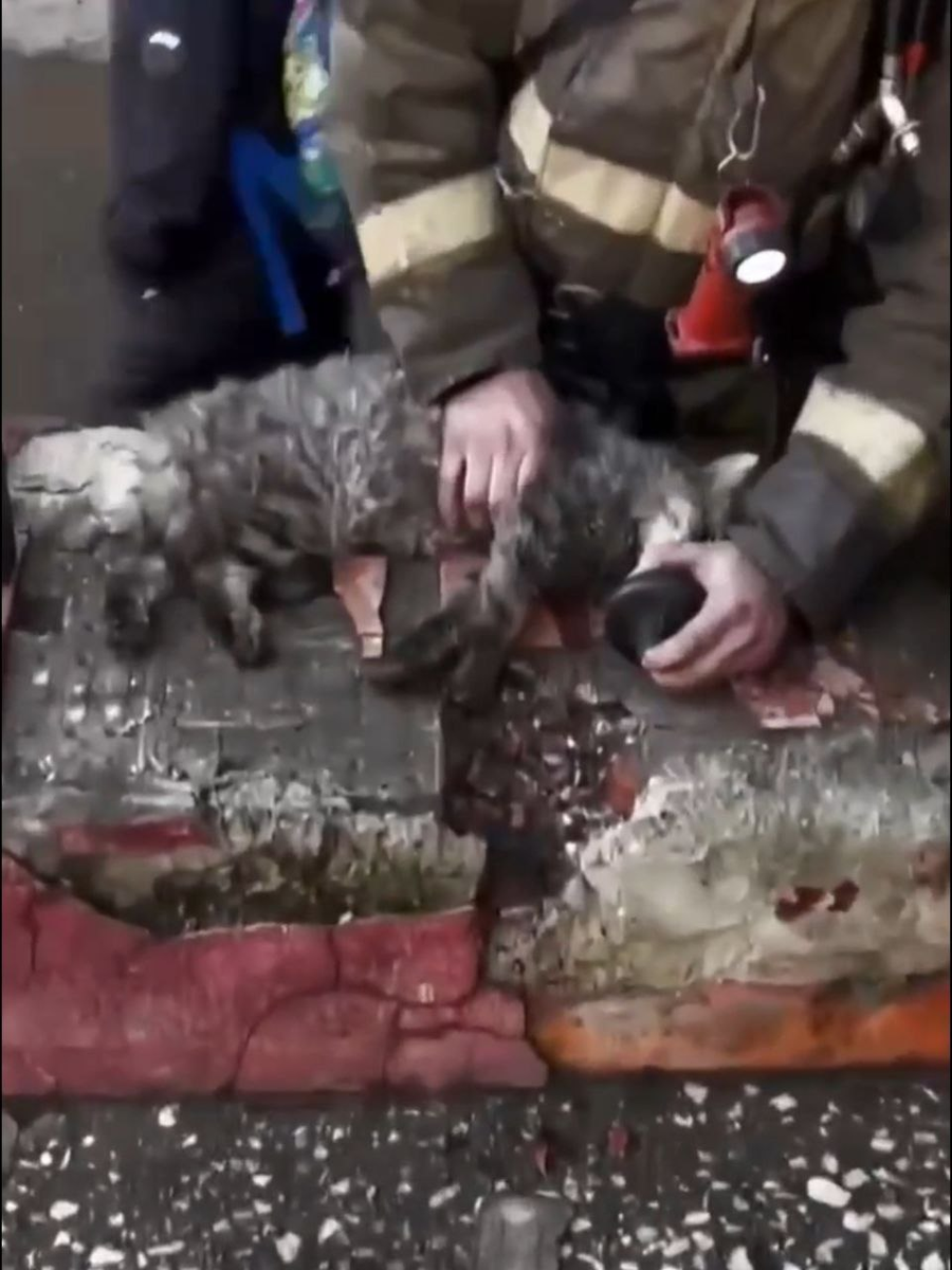 Второй кот — тот, что лежал у балкона — оказался в худшем состоянии. Руслан работал с ним почти три минуты, прежде чем появился первый отклик. Когда животное наконец задышало, у нескольких пожарных, стоявших вокруг, заблестели глаза.