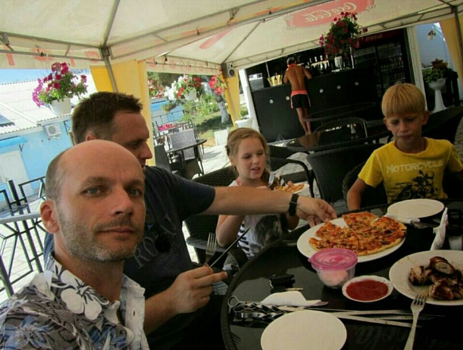ПРО ФОТО: это мне Вадим прислал, друг и одноклассник. Рядом с ним его дочка Маша, рядом с ней мой племянник Давид, сын Кати и Васи. Она тоже есть за столом, как и другой мой племянник Артём, сын Вовы и Яны, он тоже есть за столом. Это мы в Орловке, на Северной стороне Севастополя, в пансионате "Звёздный берег", на пляж которого приехали на целый день, мы с Лётчиков, а Вадим и Маша с Победы, его жена Ира осталась дома. Фотографировал-то я, и на свой фотоаппарат, и видимо все фотки переслал Вадиму, у себя надо искать. Просто оказалась на очереди в этот день. А присылал он мне где-то полгода назад, дождалась.