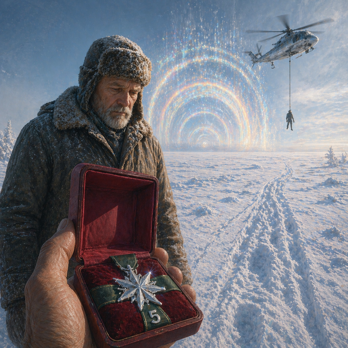 Петров Степаныч открыл коробку. Там, на бордовой пухлой подушечке лежала отполированная до зеркального блеска семилучевая Снежинка. Зелёная муаровая лента с приколотой цифрой пять обвивала подушечку, не позволяя Снежинке упасть.