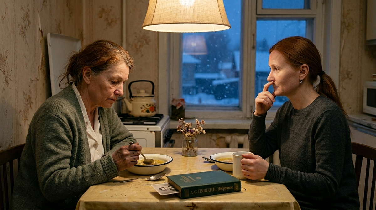 Надежда стояла посреди гостиной и смотрела на лист на серванте. На сухой букет. На кружку с холодным чаем. На дверь в кабинет, где на верхней полке стоял Пушкин в зелёном переплёте. Гриша привёз его когда-то из Ленинграда, с Литейного. Том третий он брал чаще других. Поглаживал корешок большим пальцем.