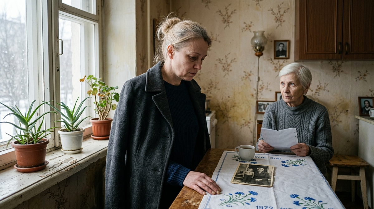 Дверь закрылась тихо. Антонина осталась за столом. Перед ней – фотография, лист с цифрами и скатерть с двумя датами по краю. Она посмотрела на первую дату внимательнее, чем за всю свою пятидесятидвухлетнюю жизнь.